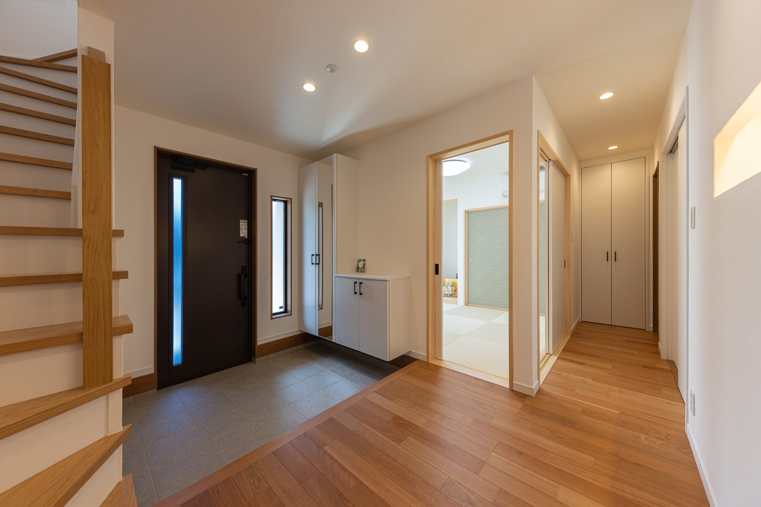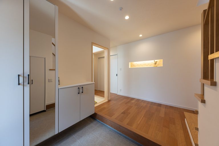 はじめに紹介するお家の特徴は、白基調の清潔感のある玄関スペースです。階段下を工夫して、収納を作成しました。さらに、玄関正面に照明付きのニッチを設置 季節の小物を置いて楽しむことができ、おしゃれなこだわりポイントになりました。