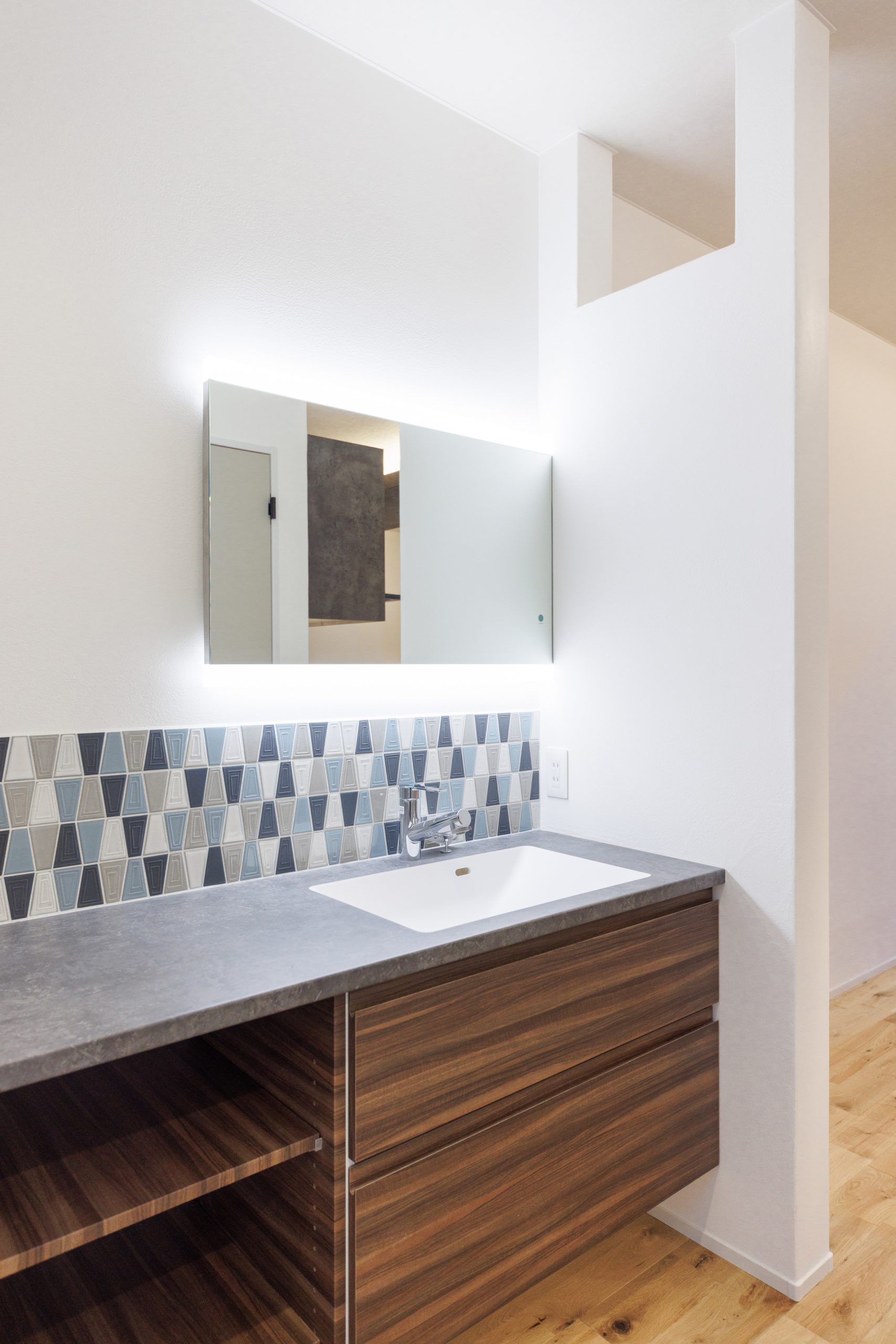 洗面台は、奥様がメイクをしやすいように横長に設計し、タッチセンサー付きの鏡を採用しました。壁の一部をタイル調にすることで、アクセントにしています。