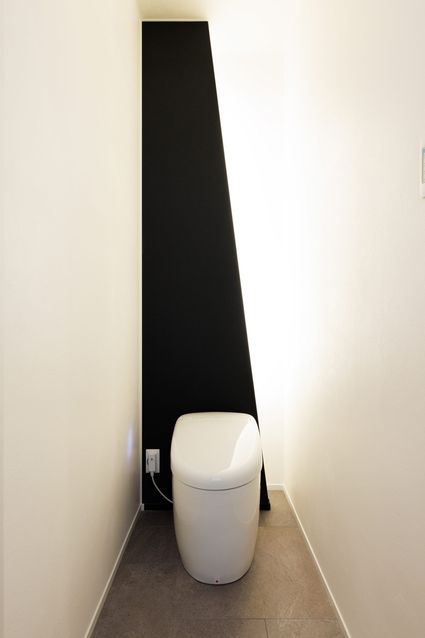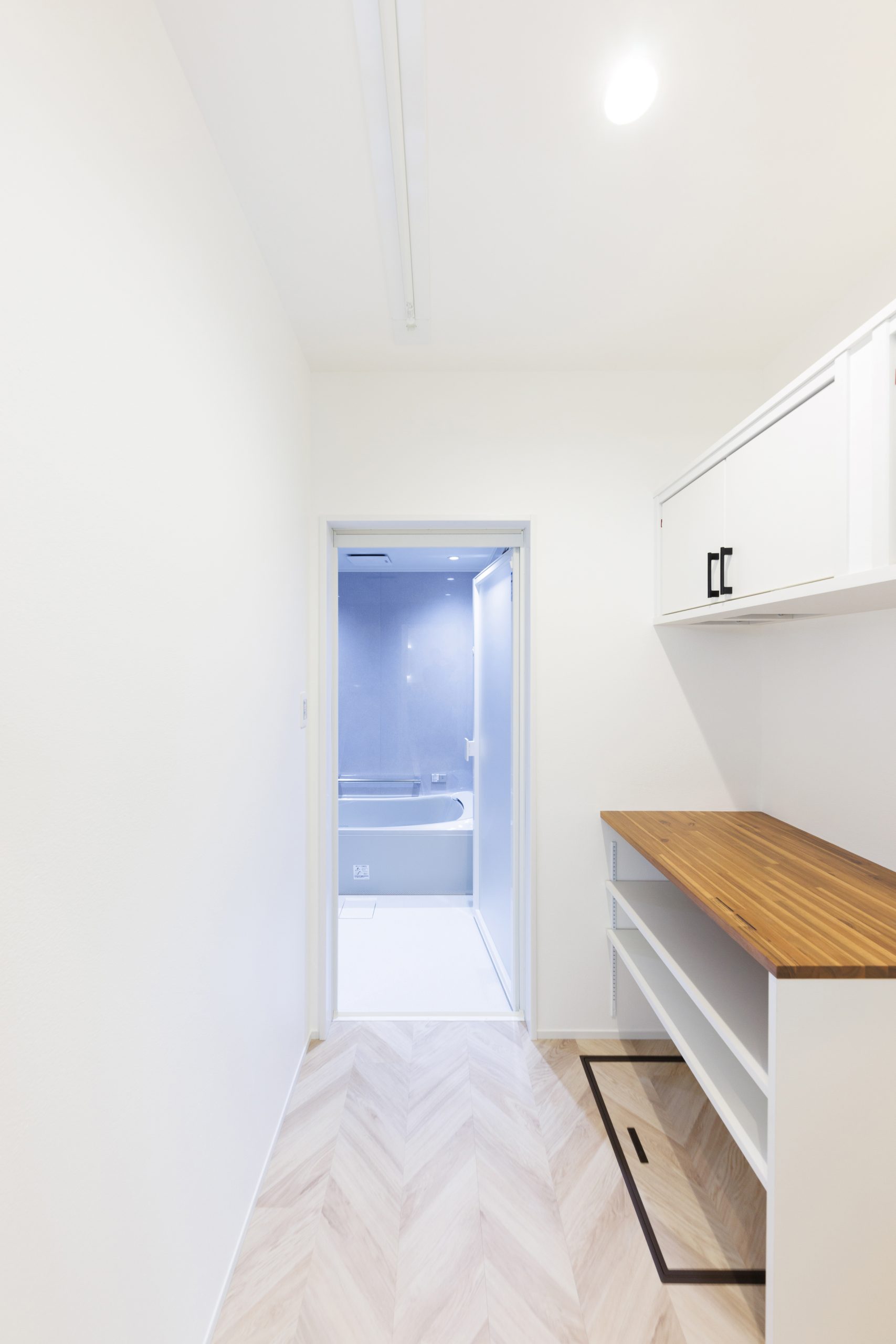 トイレは、斜め壁のデザインにし、裏側から照らす間接照明をセットでホテルライクな仕上がりにしています。脱衣所は、家事をしやすくするため広さを確保し、したからタオルを取り出せる造作家具は、とても使いやすくお気に入りです。
