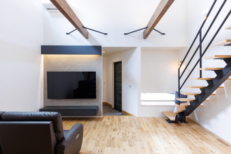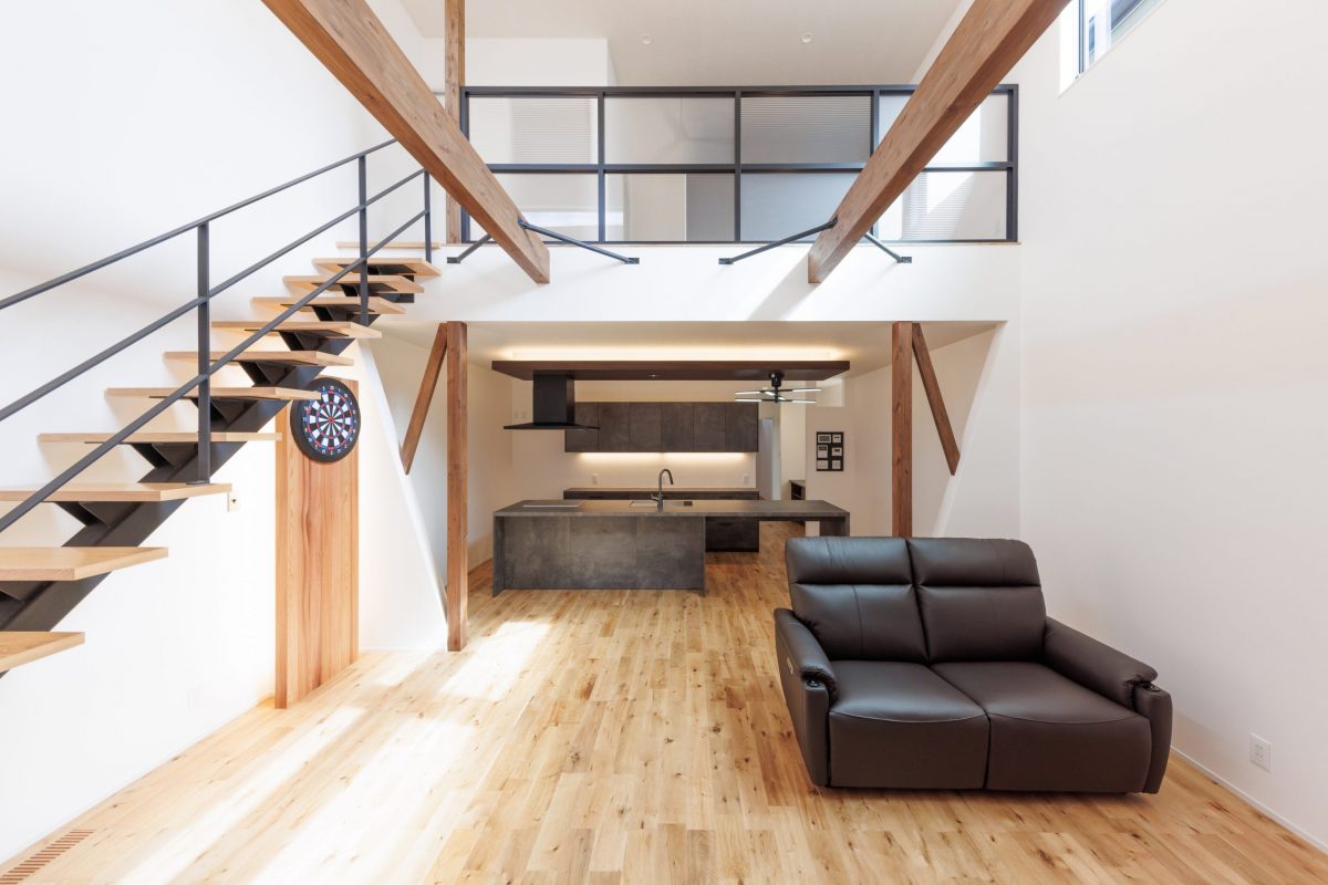 次に紹介するお家の特徴は、大人かっこいいリビングです。リビングは、友人が遊びに来てもゆったり過ごせる広々とした空間です。10帖もある大きな吹き抜けがあり、窓から明るい日差しが気持ちよく、とても開放的になります。