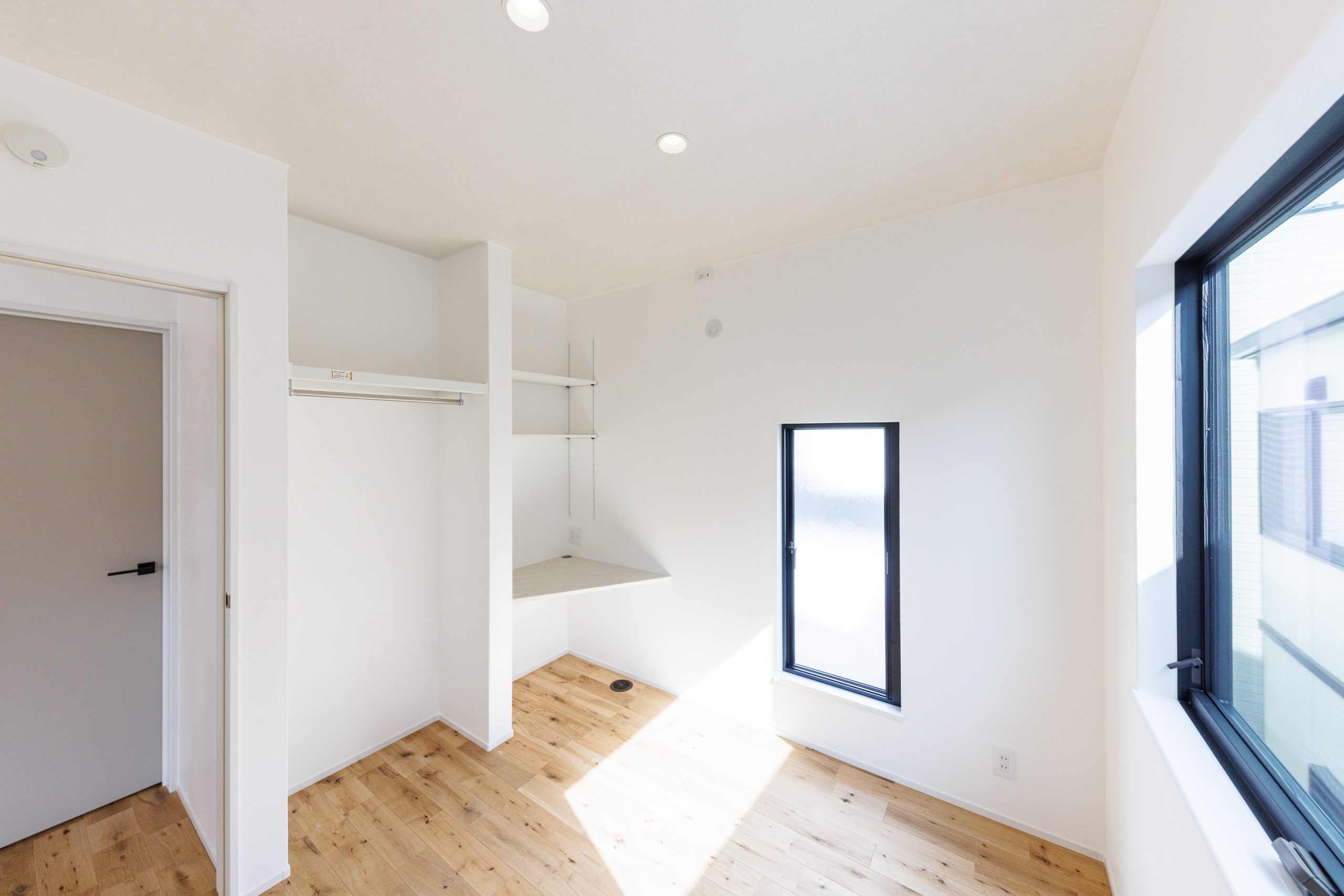 また寝室の奥には、パイプの数を多くしたウォークインクローゼットがあり、多くの衣類を収納することができます。クローゼット内には、衣類以外に収納できる棚もあるため、大きな荷物も収納することができます。