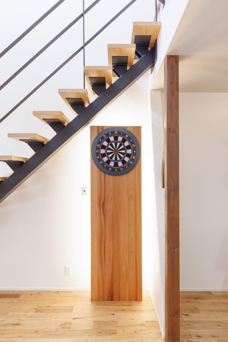 デッドスペースとなりがちな階段下には、趣味であるダーツスペースを設置しているのも、お家の特徴です。手入れなどは必要なく、いつでも気軽にダーツを楽しむことができます。