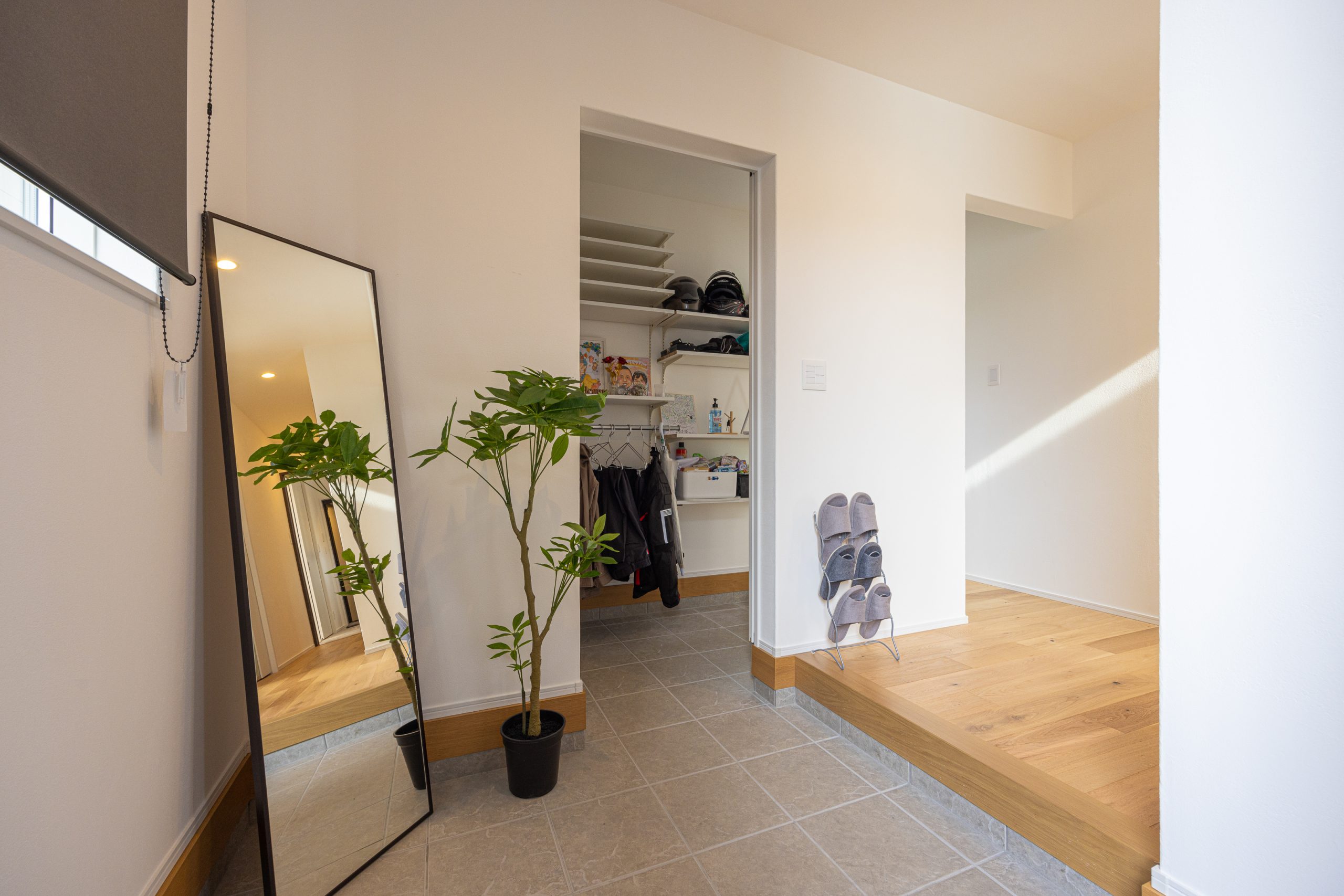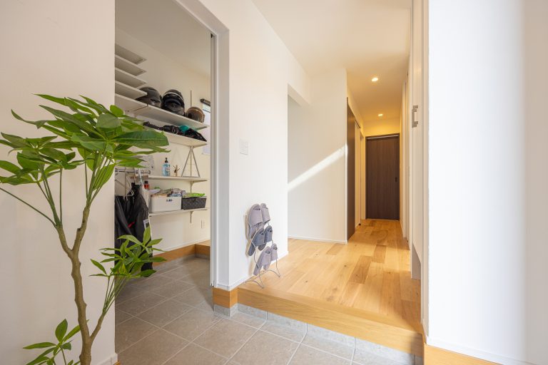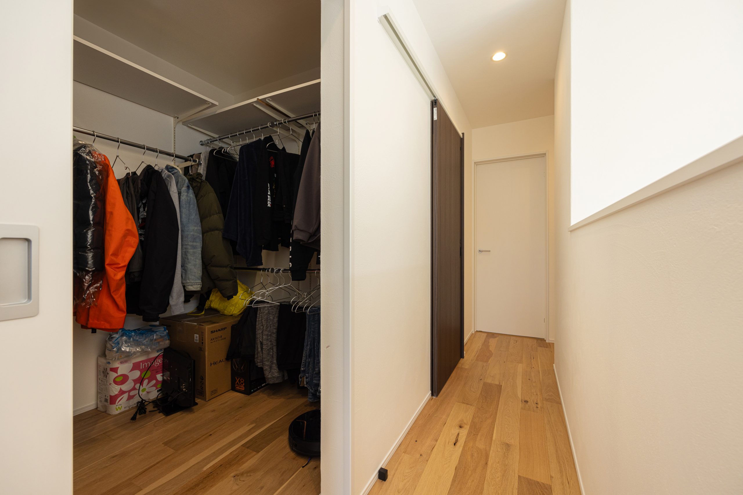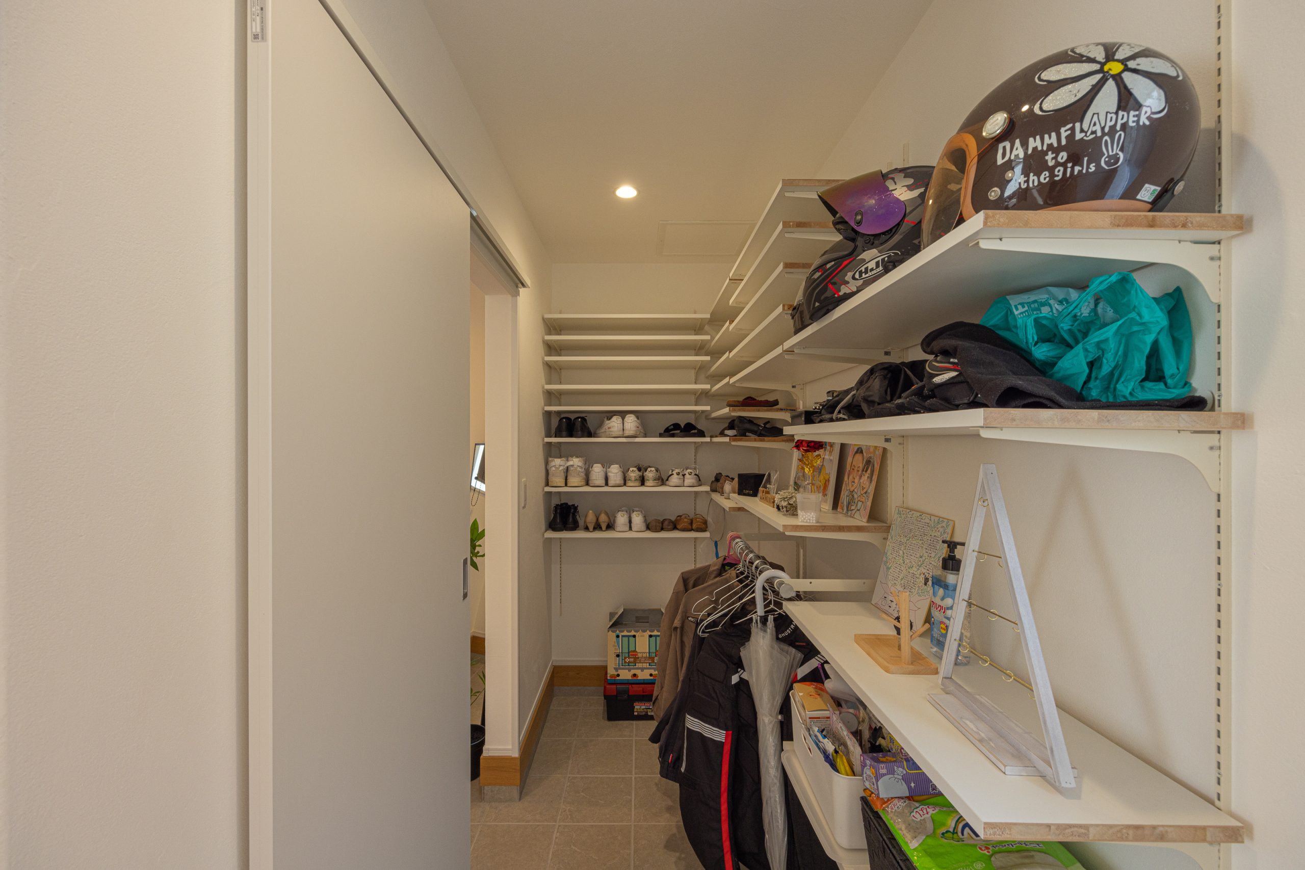 収納スペースが多いのも、オーナー様ご夫婦のお家の特徴です。玄関を入ってすぐの場所に大容量のシューズクローク、キッチンには扉付きのパントリー、二階にも、大型のファミリークローゼットを設置しました。
