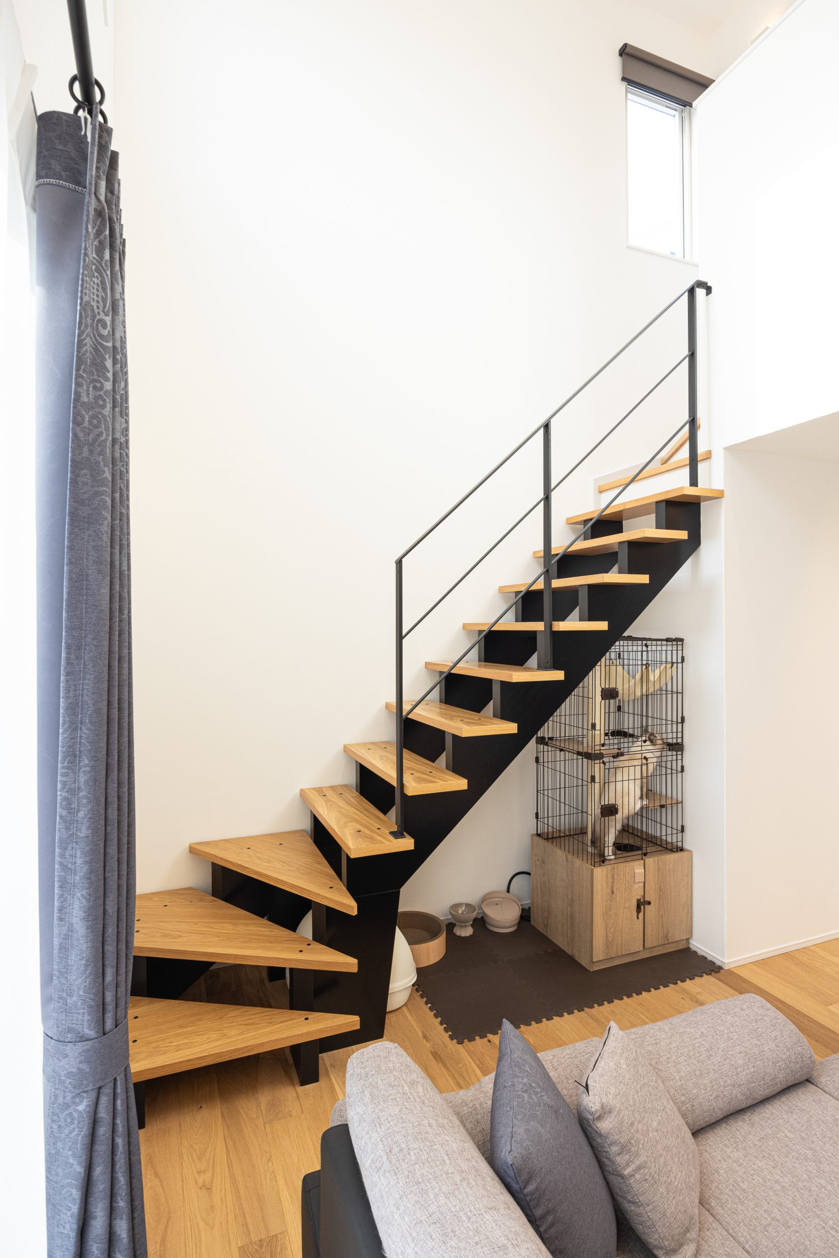 日がよく差し込む窓際にはキャットタワーを設置し、猫ちゃんがくつろげる空間も実現しました。家事の効率化を実現し、つくり出した時間をリビングで楽しむオーナー様ご夫婦やお子様、猫ちゃんがくつろいでいる光景が、目に浮かびます。
