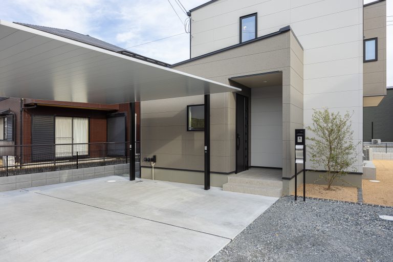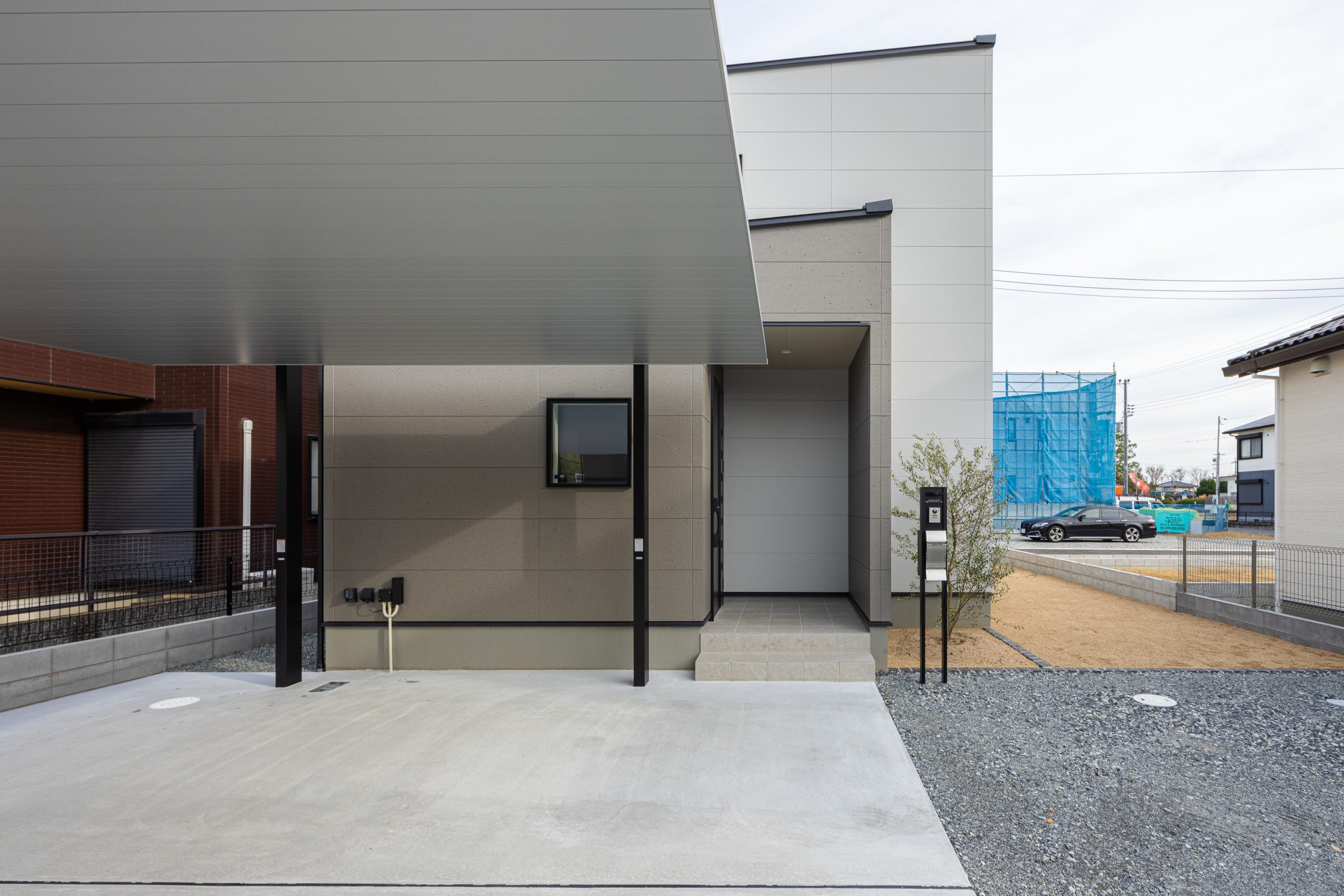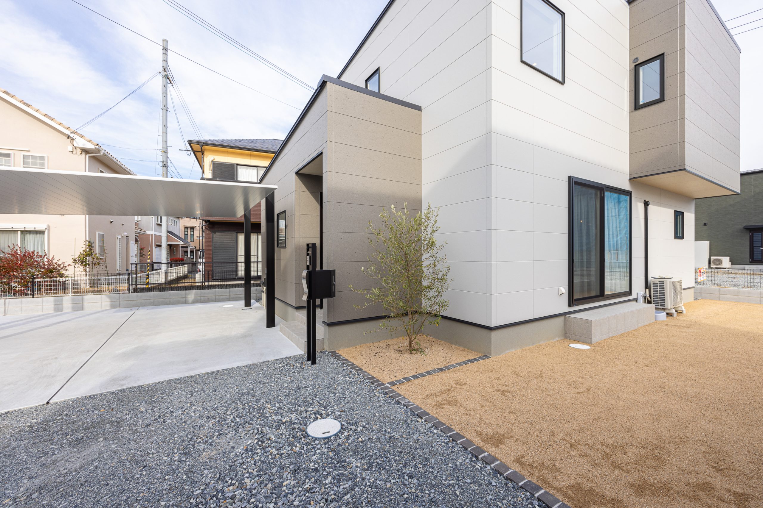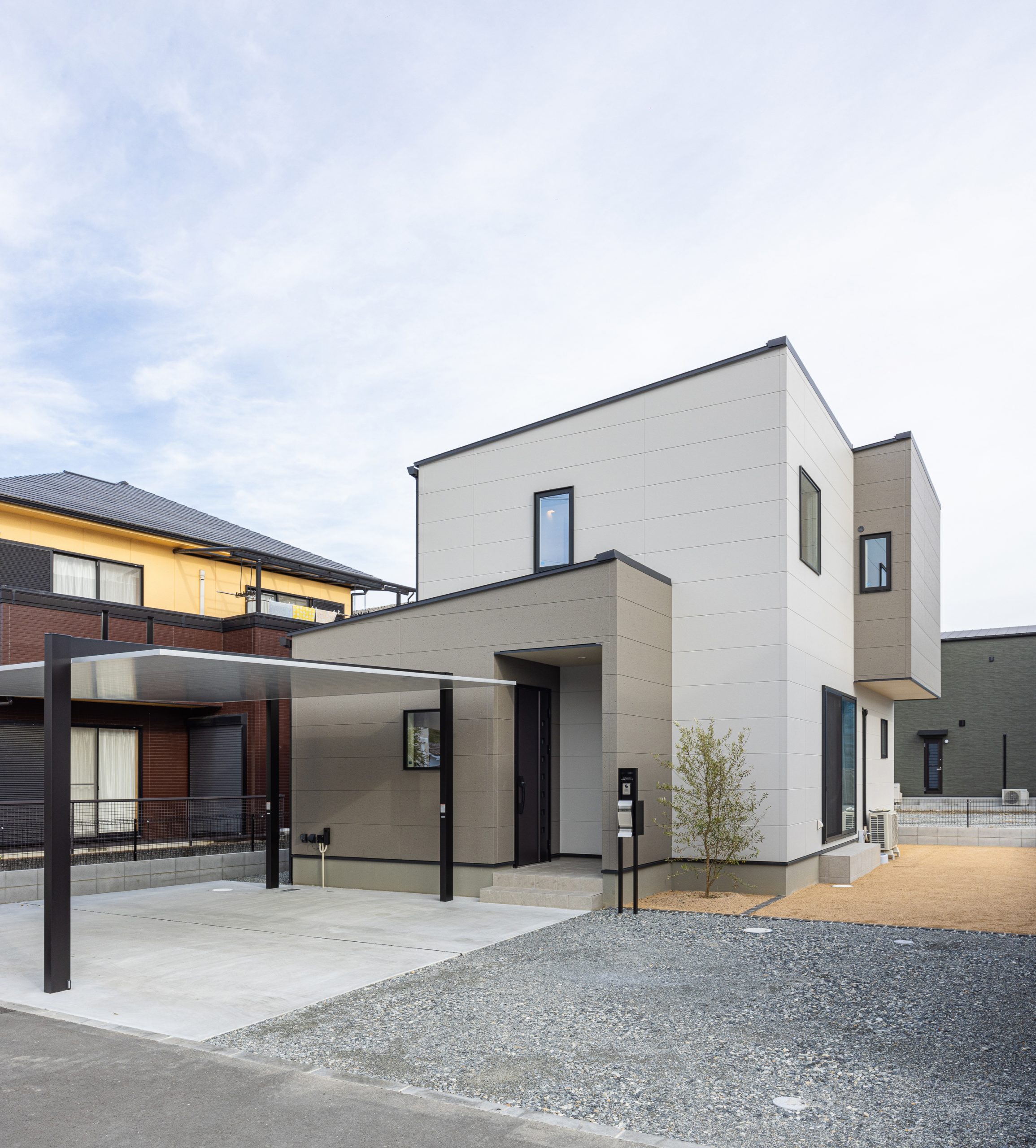 キューブを組み合わせた外観も可愛らしいほか、オーバーハング部分だけカラーを変えたり、建物と調和するようにデザイン性を意識したカーポートを設置したりと、工夫が凝らされていることがうかがえます。