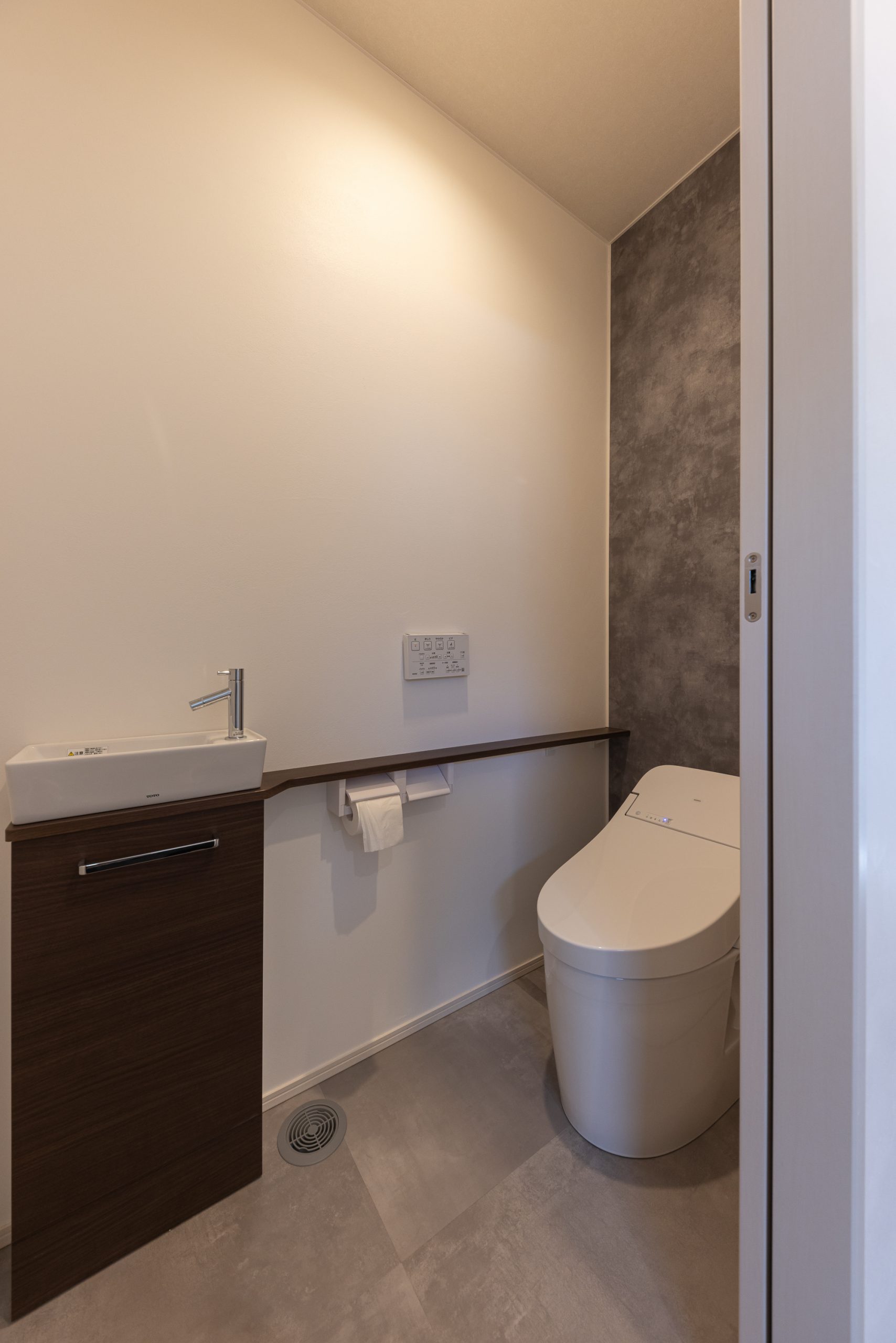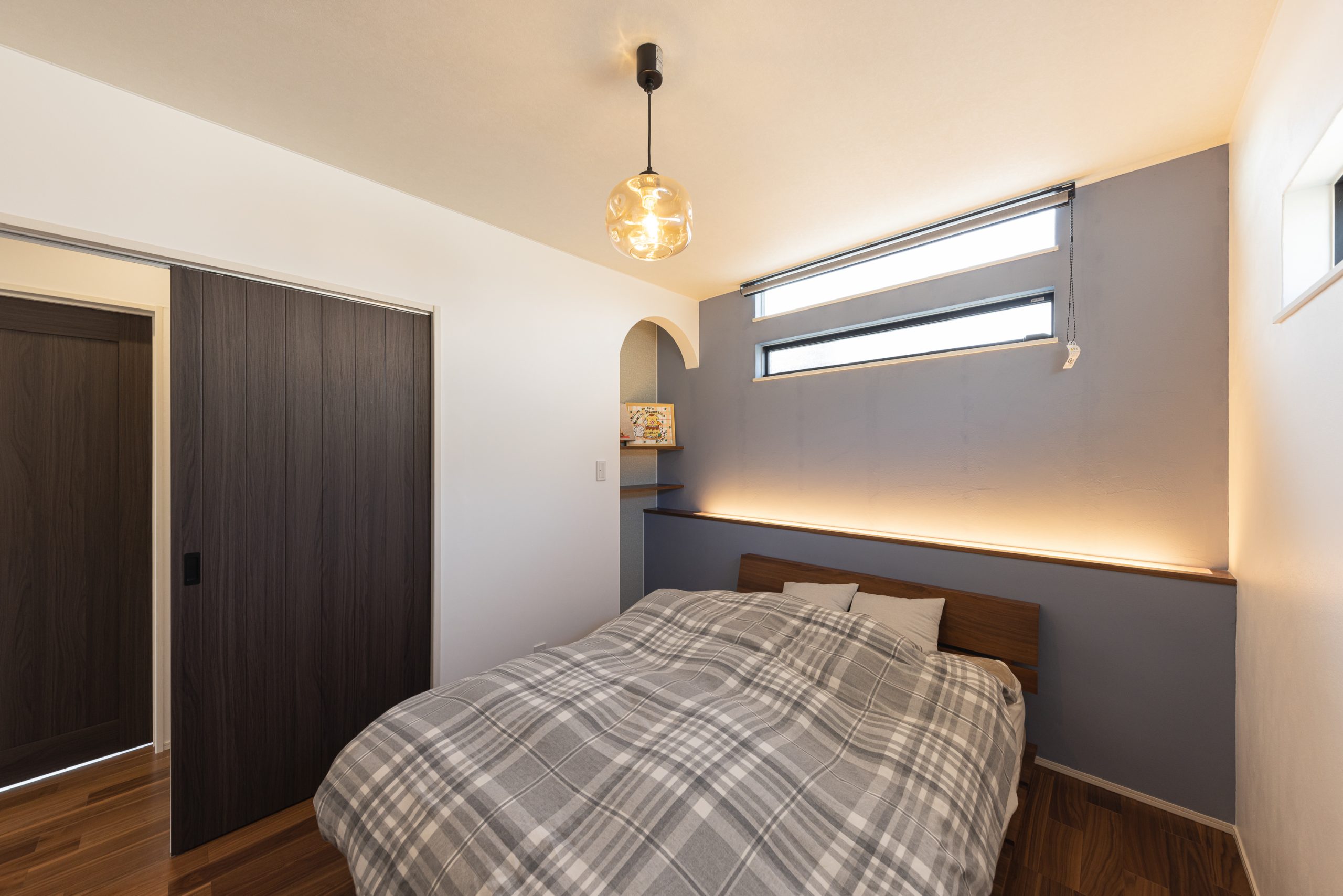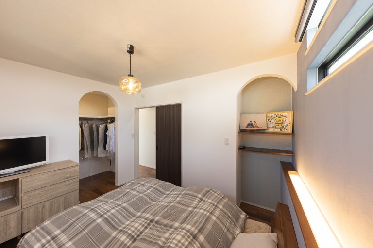最後に紹介するお家の特徴は、周りの住宅と一線を画した片流れのシンプルモダンな外観と、こだわった内装です。街の人の目を惹く外観は、デザイン性に富んだ設計ができるキノエデザインに頼んで良かったと思うポイントでもあるようです。 また内装も細部にまでこだわりました。特に寝室の棚やウォークインクローゼットに入る際の丸く描かれたアーチは可愛らしく、ふとした瞬間に目に入り、癒やされているそうです。
