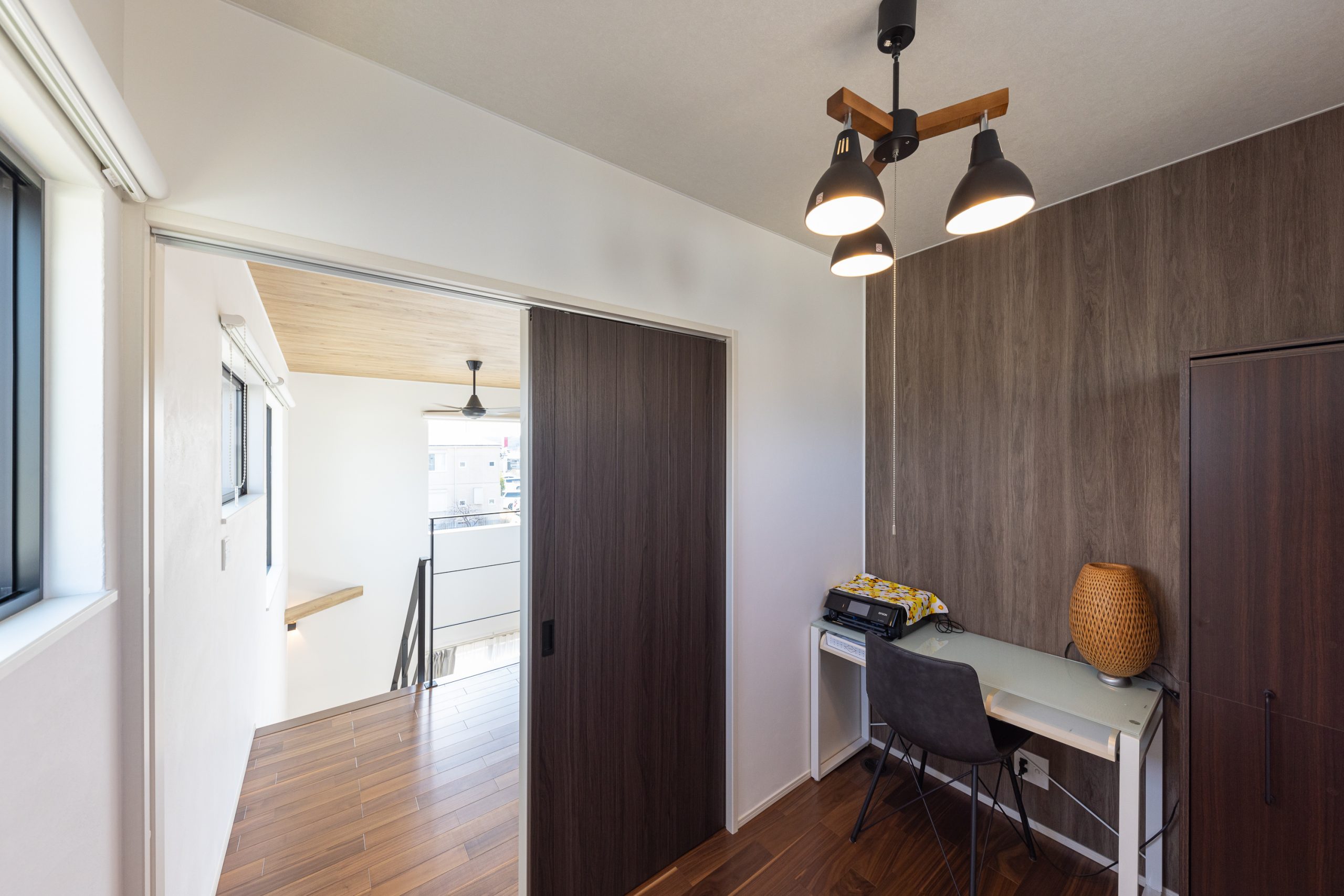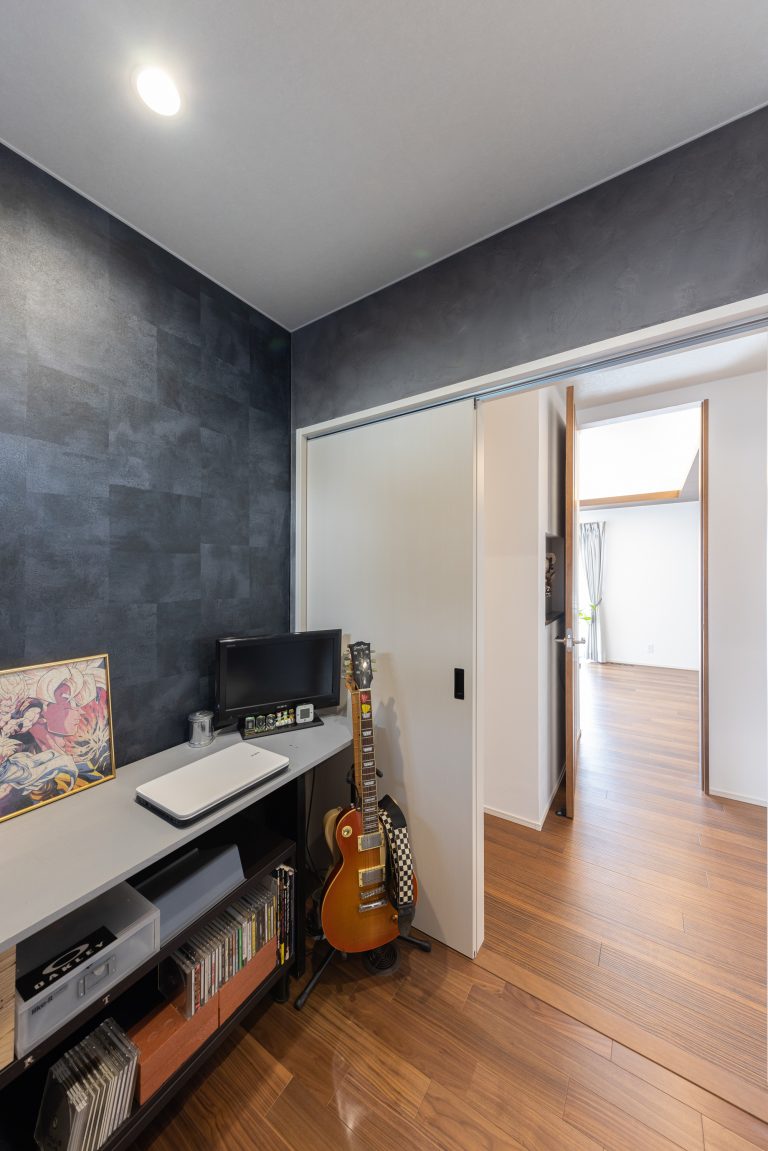 趣味を楽しめる空間も、お家の特徴です。玄関を入ってすぐに、ご主人がギターを楽しめる書斎スペースを設けました。 書斎スペースは壁紙が変えてあるため、入室してすぐに気分が変えられるほか、2階のまだ使用していない部屋は、テレワーク用の仕事スペースとして活用しています。将来の家族構成によってさまざまな使い方ができる部屋があるため、便利だと感じているそうです。