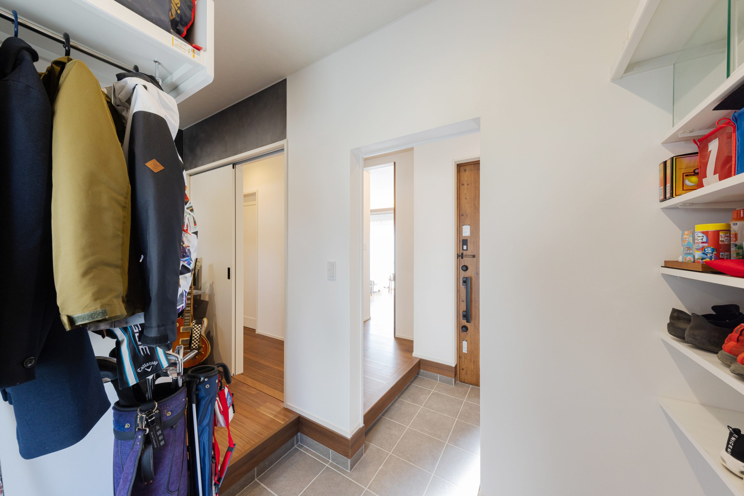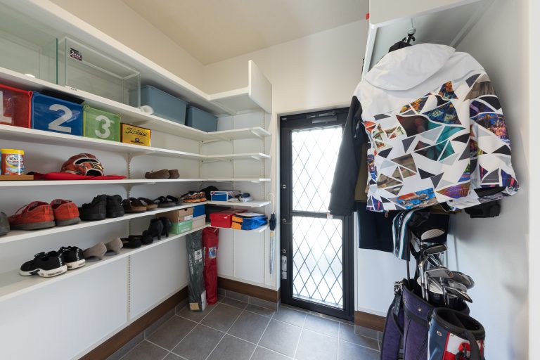 ご夫婦共通の趣味でもあるスノーボード用品を収納できる玄関横の大型収納も、お家の特徴です。収納に大きなスペースを取ってしまうスノーボード用品は、賃貸での困りごとの一つでした。 家を設計する際に、玄関横に大きな収納を設けたため、今では余裕を持った収納ができて満足だと話すオーナー様ご夫婦。収納の奥に、外へ繋がるドアも設置してあるため、外でスノーボード用品の手入れをした後も、玄関を通らずに収納できる点も便利です。 スノーボード用品だけではなく、大型収納は防災グッズや備蓄品なども置いておけるため、さまざまな用途で利用できます。