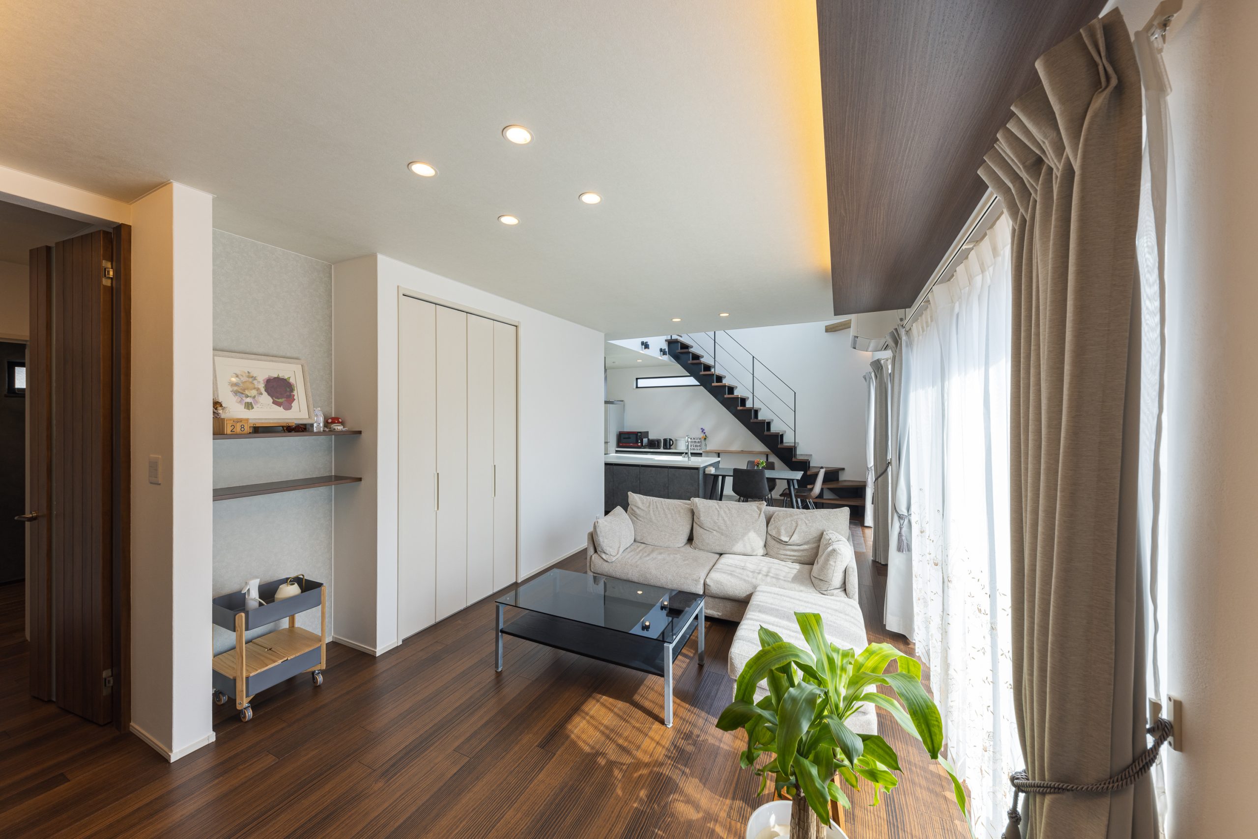はじめに紹介するお家の特徴は、家族でくつろげるリビングとダイニングです。ご夫婦で過ごす時間の多いリビングやダイニングは、特に居心地の良い空間にしたいと思ったと語るオーナー様。 ダイニングには念願の吹き抜けを設け、自然光が入る明るい空間となりました。ご夫婦で食事を取りながら、会話をする姿が目に浮かびます。 またリビングには間接照明を設け、光源が目に入らない柔らかな雰囲気を演出しました。間接照明は空間に奥行きを持たせられる効果もあるため、家族で過ごすくつろぎの時間が、より一層心地良いものとなるでしょう。