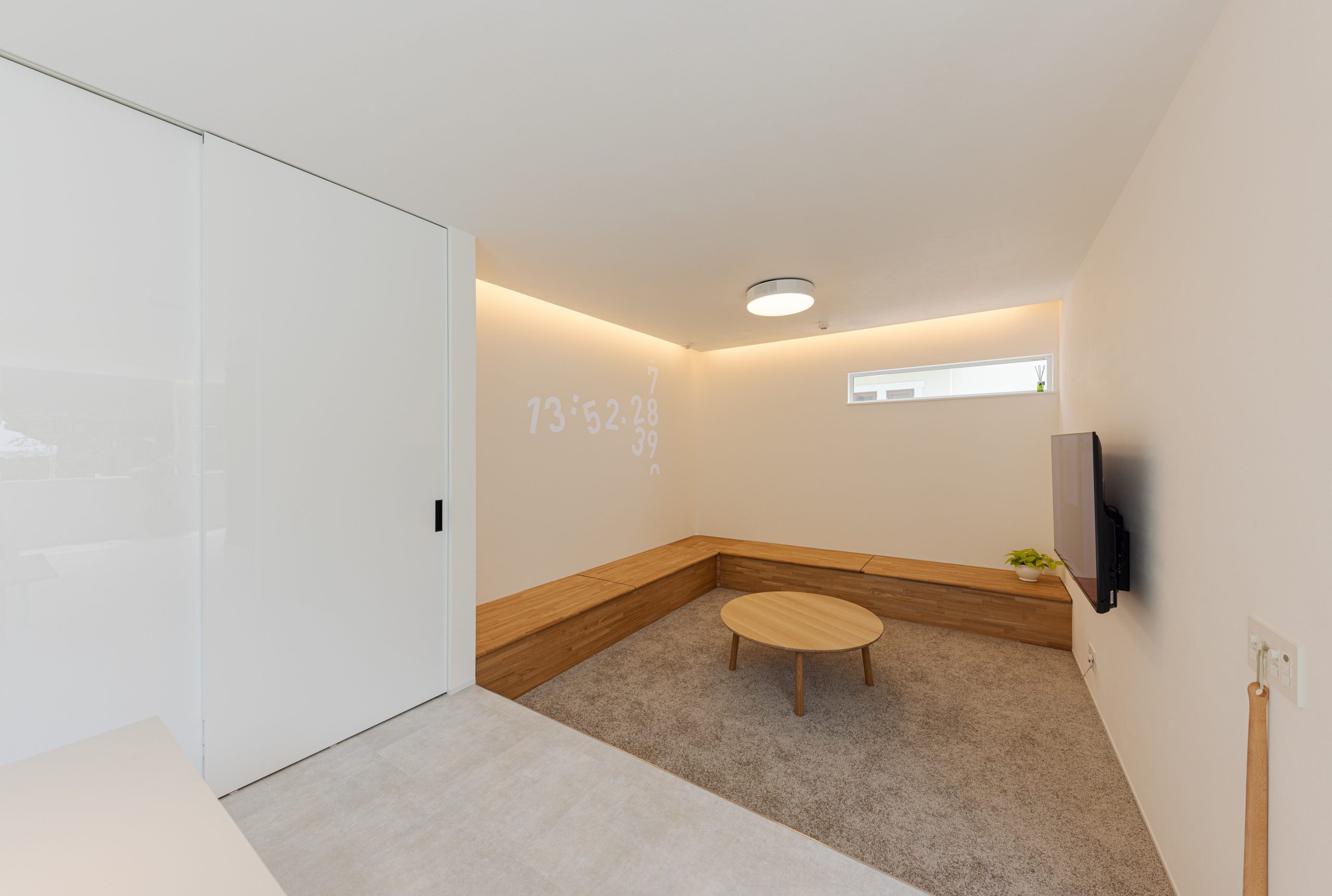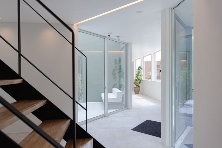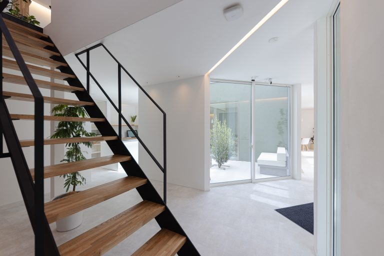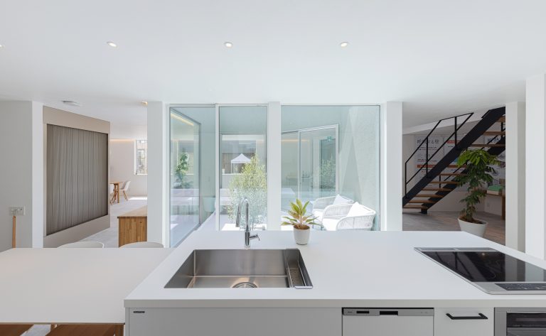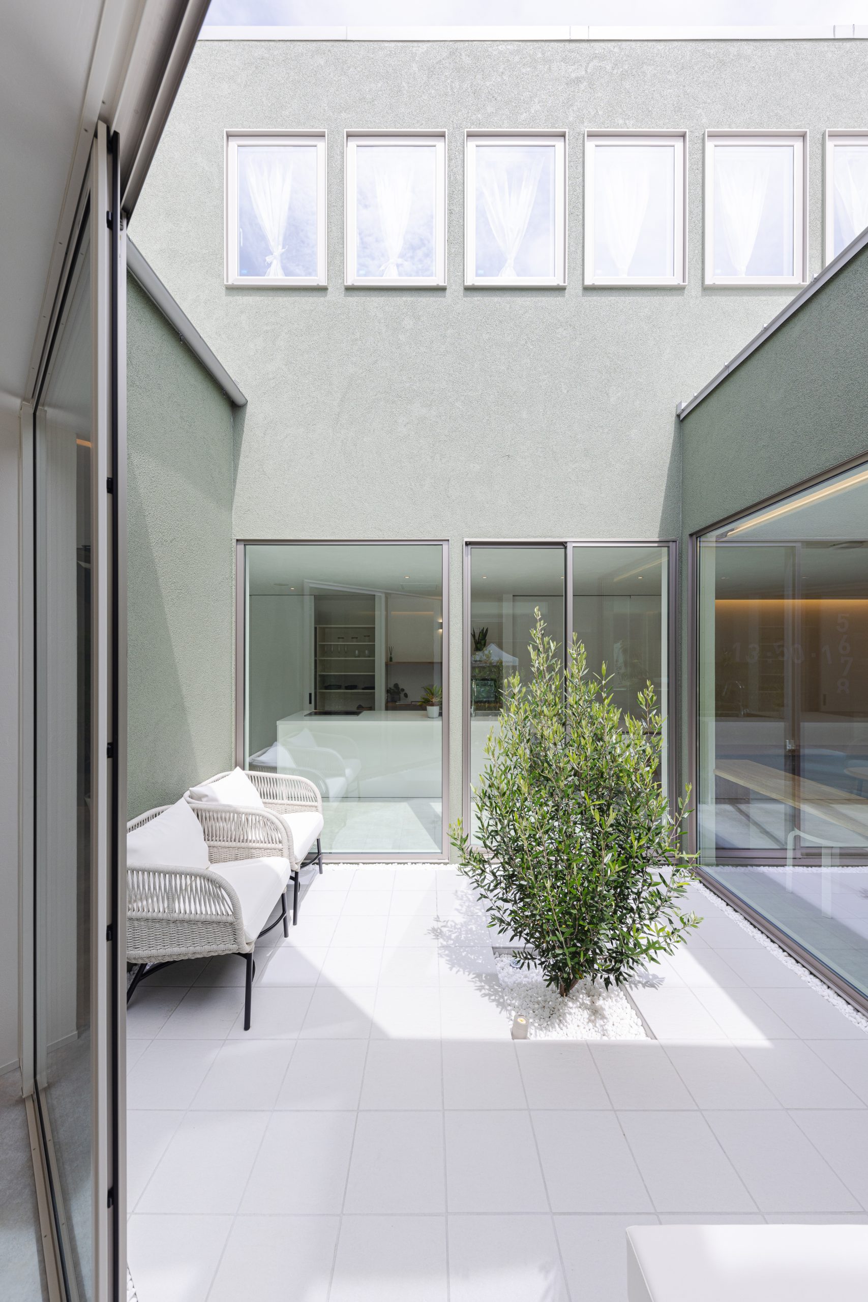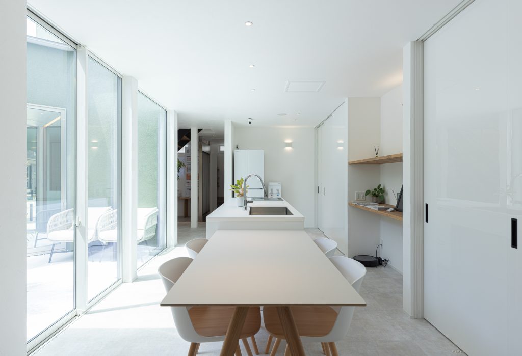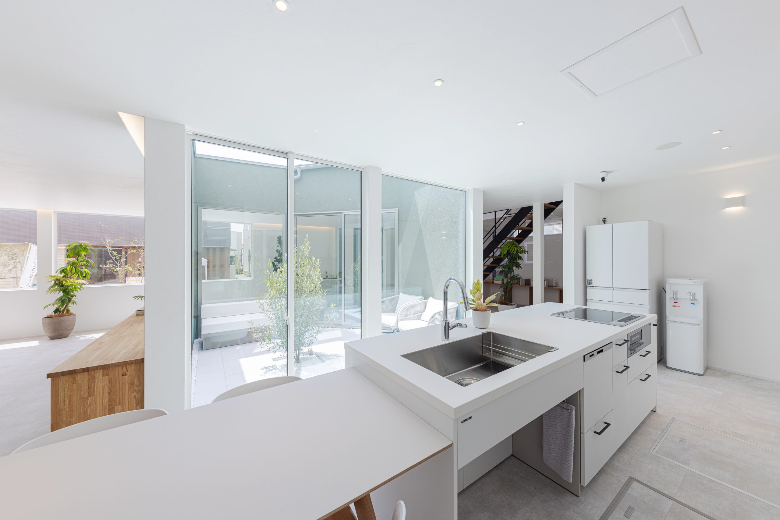 老後のことも考えて設計されつつも、開放的でモダンなデザインが特徴的な住まいは、長く快適に暮らせる工夫が随所に込められています。 中庭に面した大きな窓があるこちらの邸宅は、家の中にいても自然を感じられる設計をご要望の方におすすめです。シンプルでありながらも温かみのある住まいは、ご家族や友人など多くの人と交流できる賑やかな空間になるでしょう。