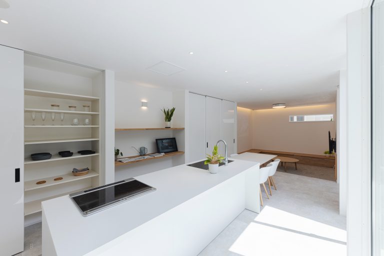 ご家族やご友人と交流できる大きめのキッチンも、お家の特徴です。キッチンの横にスペースをしっかりと確保したため、奥様がこだわりの料理を作りながら、ご家族やご友人と会話を楽しむ姿が想像できます。 壁に接していないアイランドキッチンを採用したため、どこからでも気軽にキッチンに近づけるのもポイントです。お子様が大きくなれば、一緒に料理をしたり、配膳を手伝ったりすることもしやすいでしょう。 様々な人と交流できるキッチンは、ご家族全員の大切な場所になるよう心を込めて設計しています。