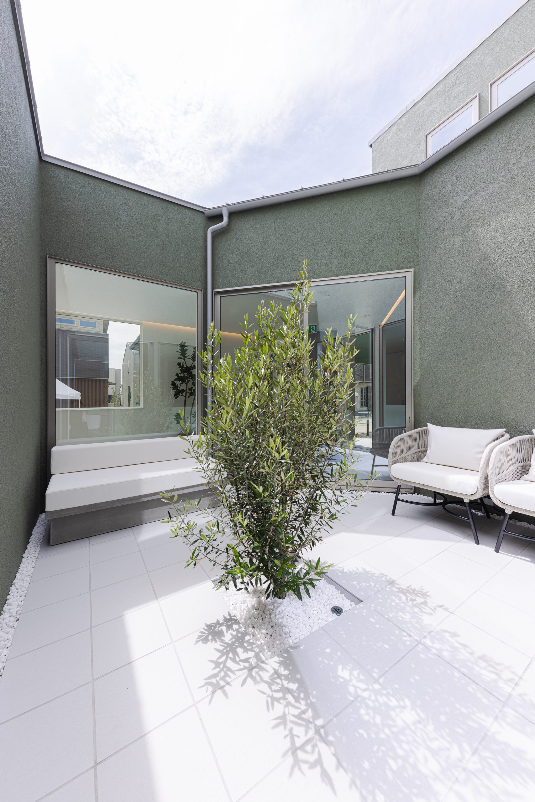最初に紹介するお家の特徴は、自然を感じられる中庭です。家でも自然を感じられたら癒やしに繋がるのではないかと、中央に木を植えた中庭を設計しました。 ゆったりと寛げる椅子に座りながら、木や空を眺めることは、平日の少しの時間でも可能です。お子様が中庭を駆け回り、ご夫婦が椅子に座ってお話する団らんの時間が目に浮かんでくるのではないでしょうか。