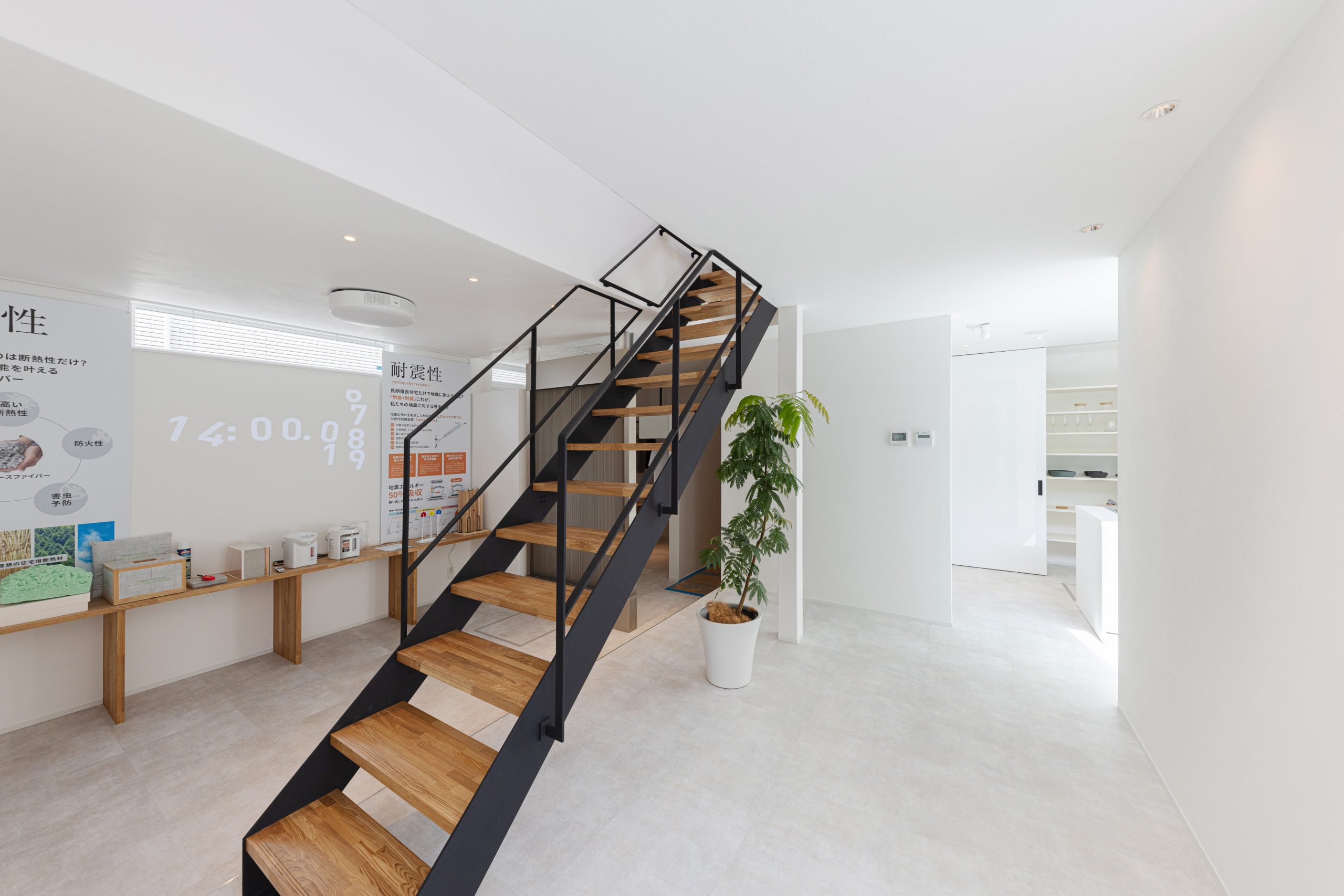 白を基調とした内装に映える階段も、お家の特徴です。大物の収納や遊び場としても使えるスキップフロアに続く階段は、スタイリッシュな黒色を採用しました。 踏み板と手すりのみのスケルトン階段ですが、傾斜が緩やかであるため、お子様でも踏み外しや転落の危険が少なく登っていただけます。また、緩やかな階段は将来の足腰に対する不安を解消できるのではないでしょうか。 存在感が出やすい階段は、スケルトン階段にすることで、黒色であっても部屋を感じさせない効果を持っています。これから住宅を建てようと考えている方も、ぜひ参考にしていただきたい工夫です。