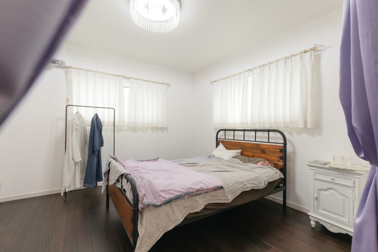 寝室は窓を2箇所取り付け、朝日を採りこむデザインにしています。寝室はくつろげる空間にして眠りに入りやすくするために、荷物をいろいろ置きたくないというオーナー様のご要望がありました。そのため、クローゼットや収納は寝室の中に作らず、ウォークインクローゼットを2階の別のスペースに作りました。 ウォークインクローゼットは、寝室のすぐ向かいに設置し、必要なものがあればすぐに取り出せるようになっています。寝室を広く使えるためキングサイズのベッドも設置可能です。 「ウォークインクローゼットを寝室のすぐ近くに作ったので便利だし、寝室はゆったりくつろげるスペースを確保できました。」
