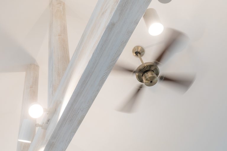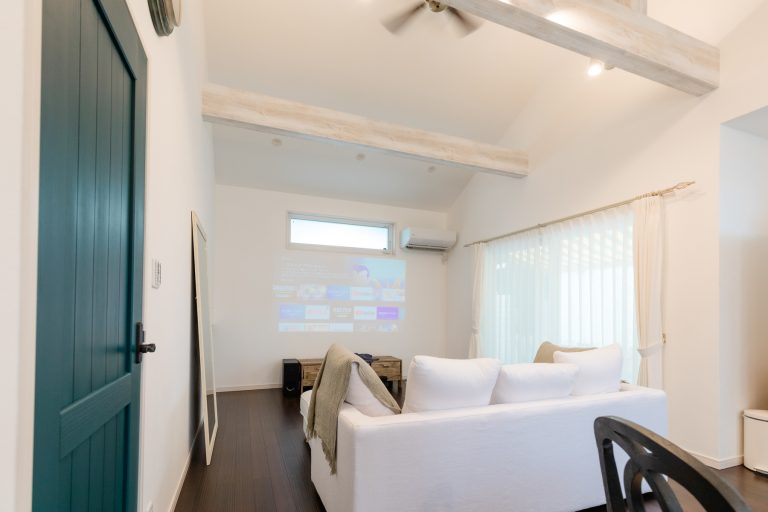 リビングダイニングは、吹き抜けにして開放感のある印象です。開口部を大きく取っているため、昼間は外からの日差しがたっぷりリビングに降り注ぎます。白を基調とした明るい空間に、グリーンの扉がアクセントとなっています。 天井には、部屋の空気を循環させられるようシーリングファンを取り付けました。「吹き抜けは、冬は寒いし室内の温度差があると友人宅で言われたので少し気になっていたんですが、機密性の高い家なので、まったくそんなことはありませんでした。」 実際のスペースよりも広々と感じられる空間に仕上がったので、ゆっくりリラックスできるとお話いただきました。