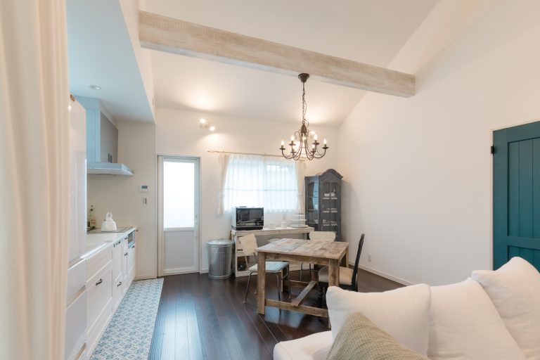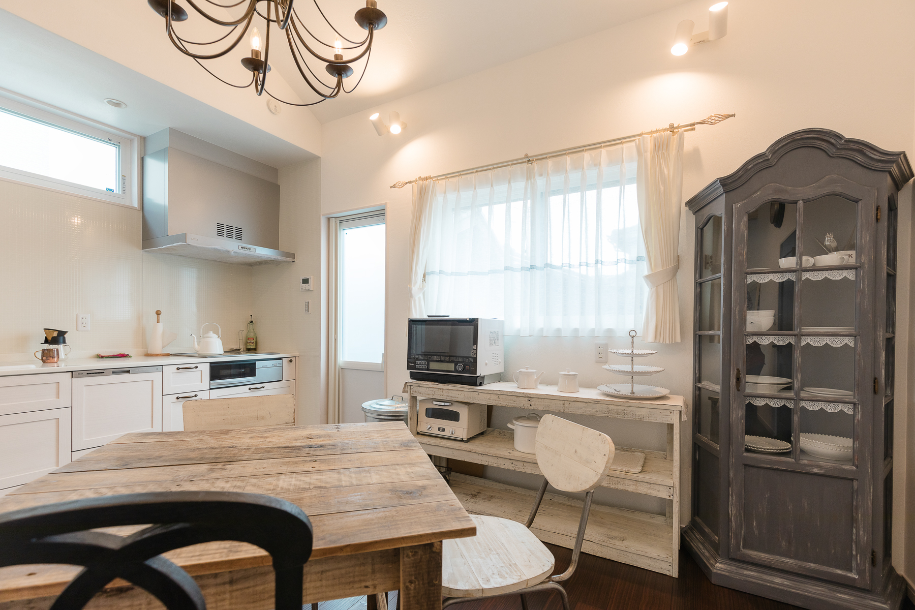 リビングは、おとぎばなしに出てくるような可愛らしい雰囲気に仕上がっています。白を基調としているため、外からの自然光と柔らかい間接照明の光によりとても明るい印象です。カーテンも大人可愛いものを使用しています。 シャンデリアや食器棚なども内装に合わせてこだわって選ばれたそうです。シャービックな印象で、温もりを感じさせてくれます。 キッチンとダイニングテーブルが近いため、家事動線が短くなり料理を運んだり後片付けをしたりするのがとても楽になったそうです。