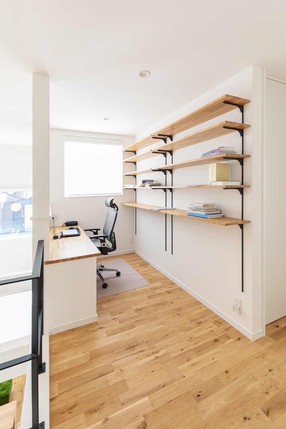 リモートワークにもできるスペースも作りたいとの要望にお応えしてつくった書斎は、階段を上がってすぐのところに設置しました。オフィスチェアと机を置いても広々とした空間は、家族の気配を感じながらも、集中する空間として最適です。
