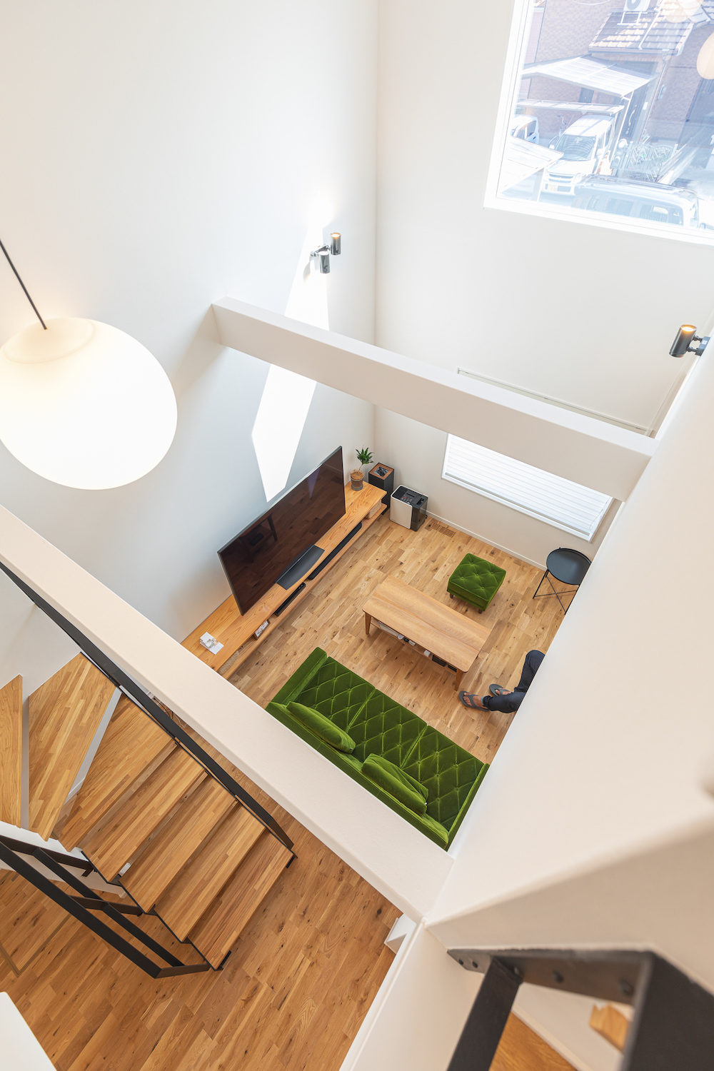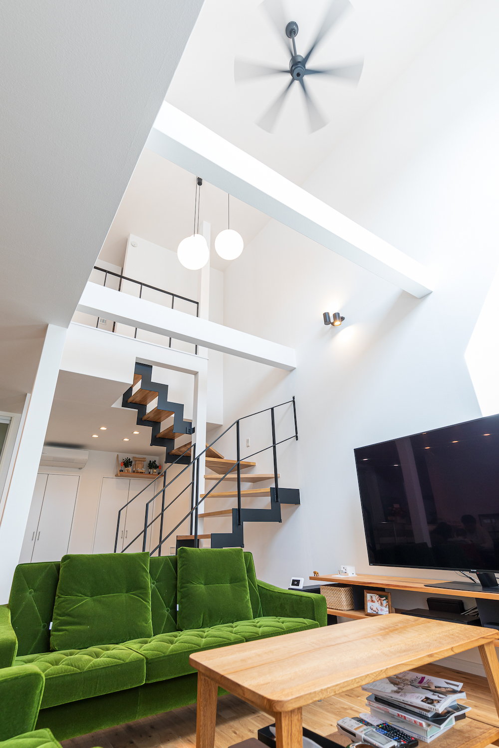 吹き抜けで得た開放感をなくしてはもったいないと選んだ素材は、アイアンです。アイアンの重厚感のある黒色は、優しい壁色とモケットグリーンのソファのバランスを損なうことなく、空間を引き締める役割を持っているのもうかがえます。
