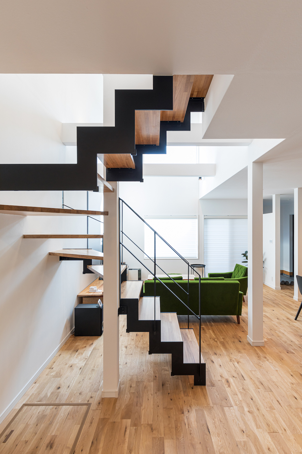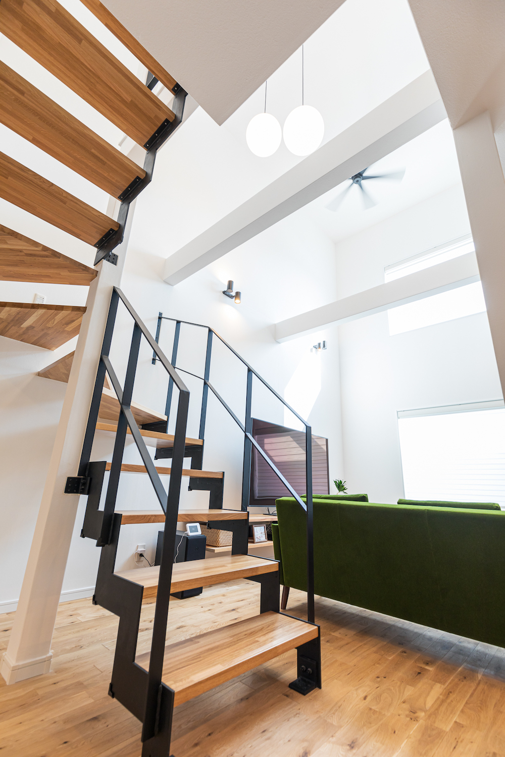 リビングに設置された2階へと繋がる階段も、お家の大きな特徴です。オーナー様ご夫妻は、子どもが大きくなって2階の自分の部屋を使うようになった時も、家族が自然と顔を合わせられるよう、リビングに階段を設置したいとの要望をお持ちでした。