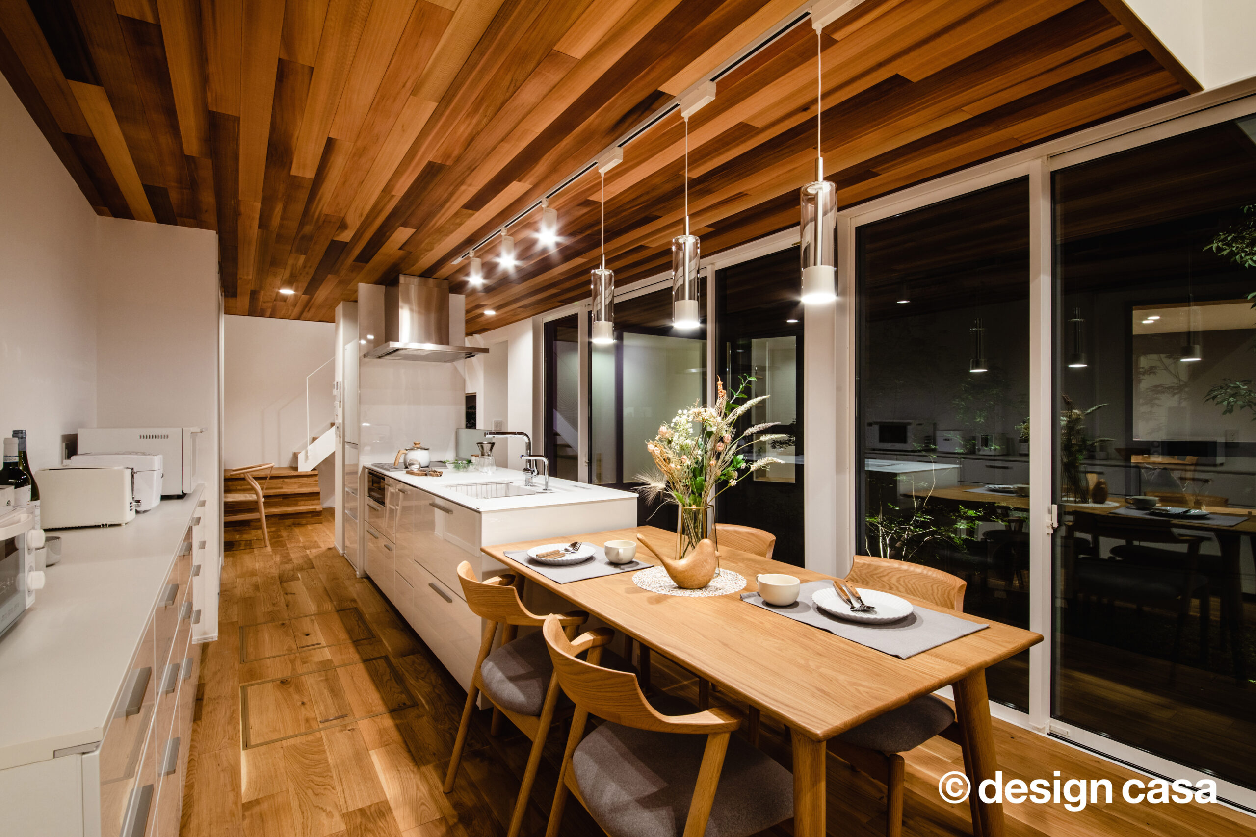 日が落ちると、天井を照らす柔らかな灯りが落ち着いた空間を創り上げます。 パティオを灯りとして愉しむ、静謐で贅沢な時間が流れます。