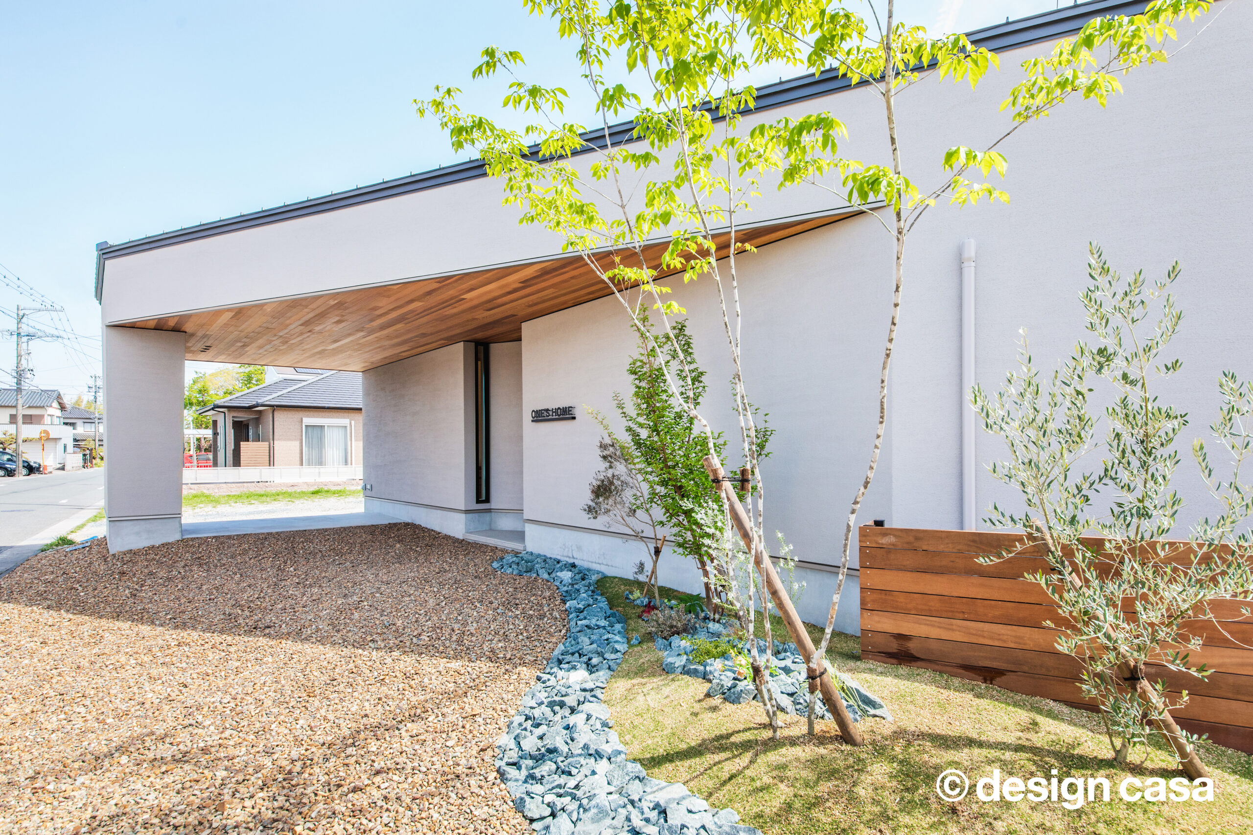 道路側からは窓を最小限に抑え、住まいのプライバシーを強固に守ります。 そのシンプルな外観は、内側に広がる光あふれるパティオ(中庭)を大切に「擁く」ためのシェルターのようです。