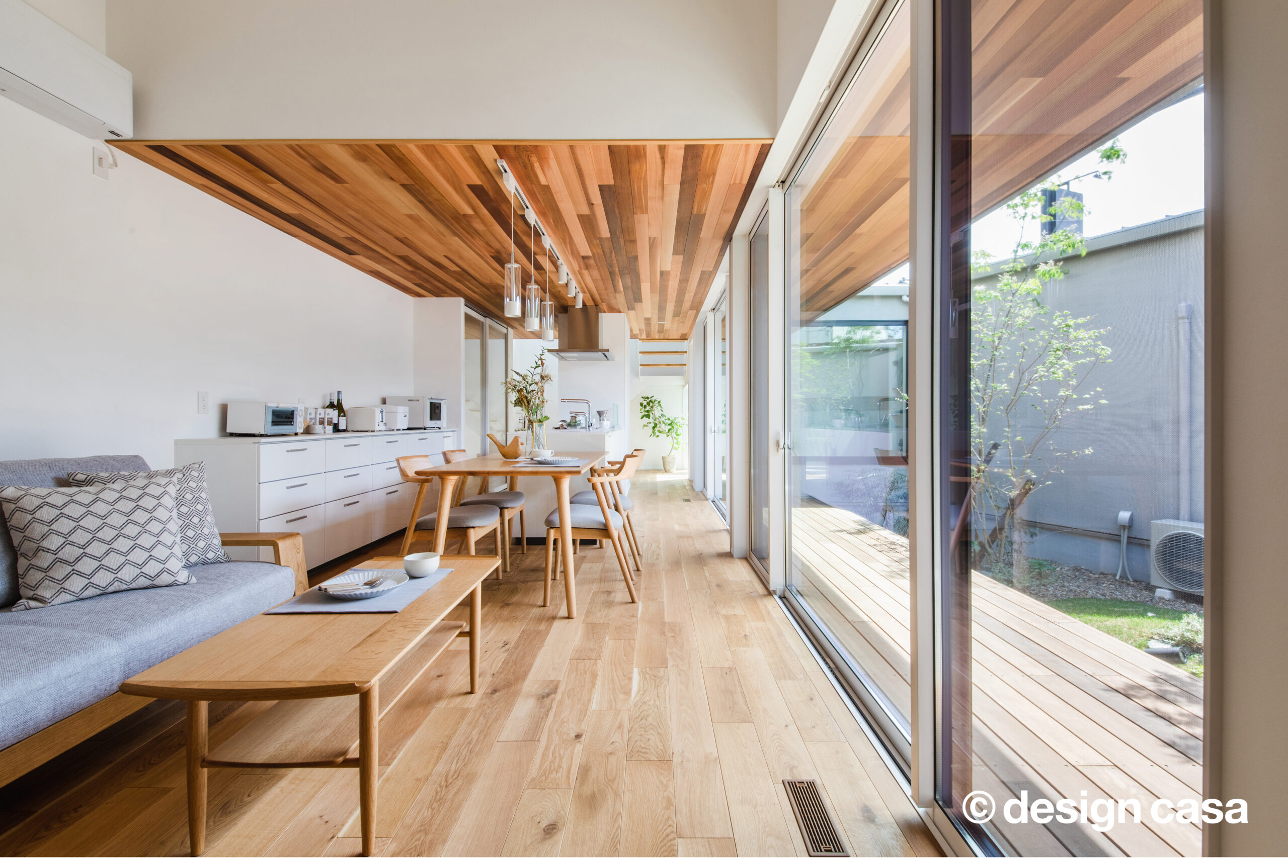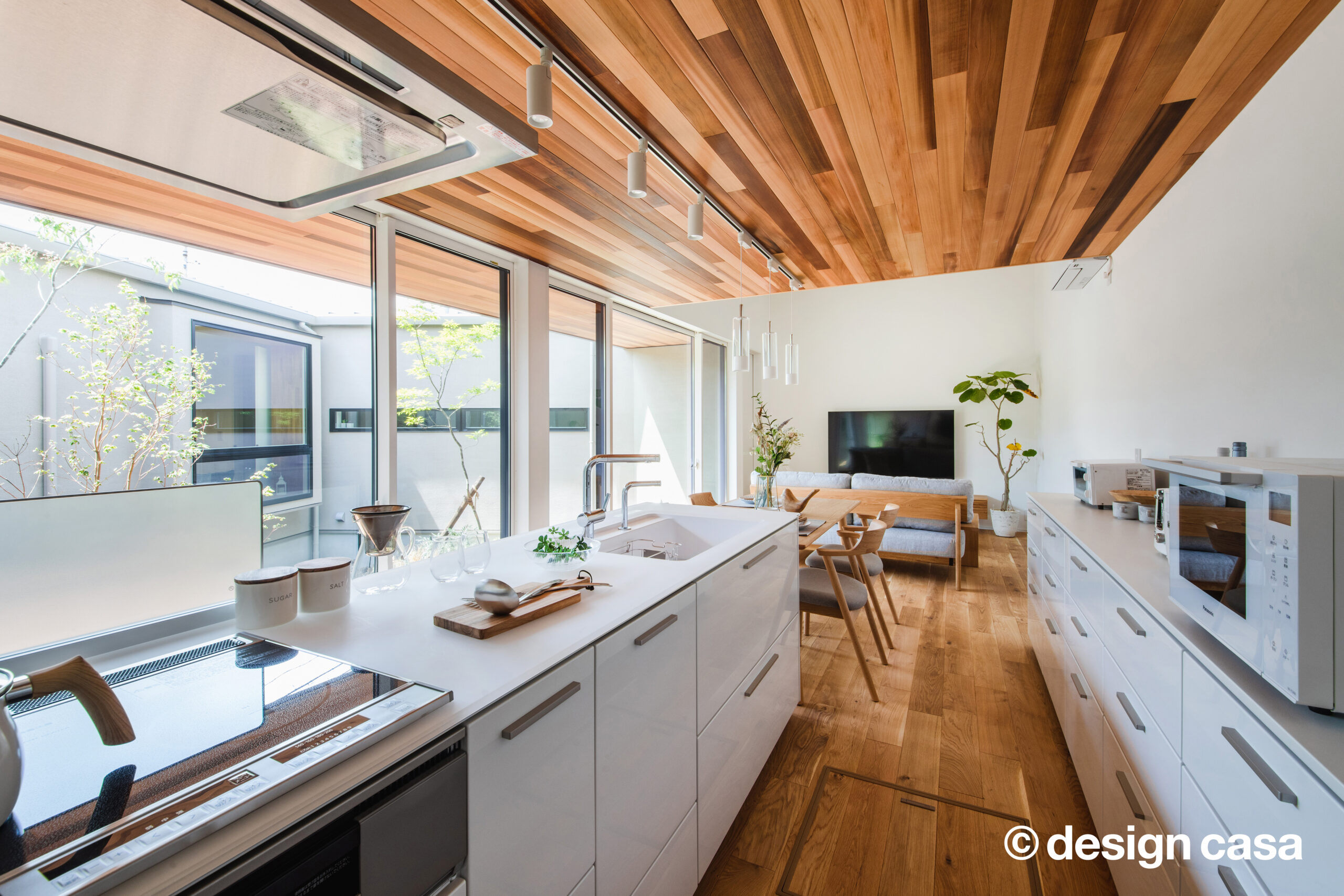 キッチンに立つと、パティオ越しに家族の笑顔と空の青さが目に飛び込みます。 料理や食事の時間が、常に光と緑に包まれる贅沢な日常です。