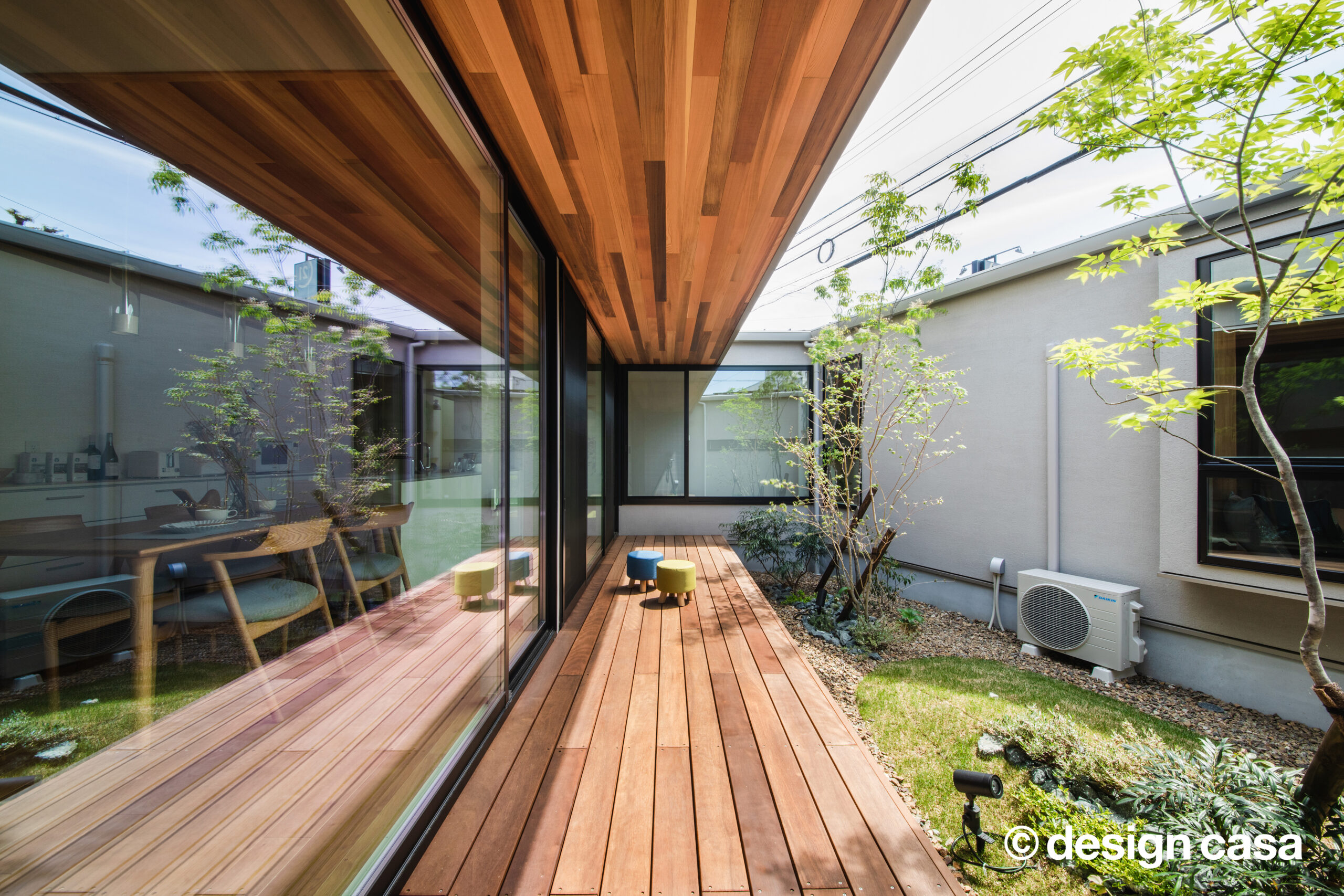 建物に守られたパティオは、家族だけの自由な屋外空間。 深い軒が日差しを遮り、周囲の視線を気にせず、風の音や光の移ろいを肌で感じる「心の余白」となります。
