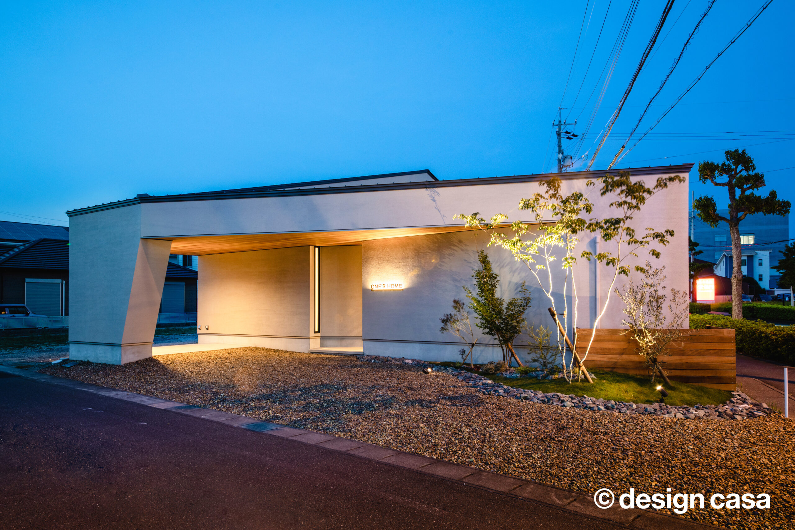 夜、パティオから漏れる光が家全体を優しく縁取ります。 外壁に落ちる樹木の影が、内に秘めた豊かな暮らしの気配を静かに物語ります。